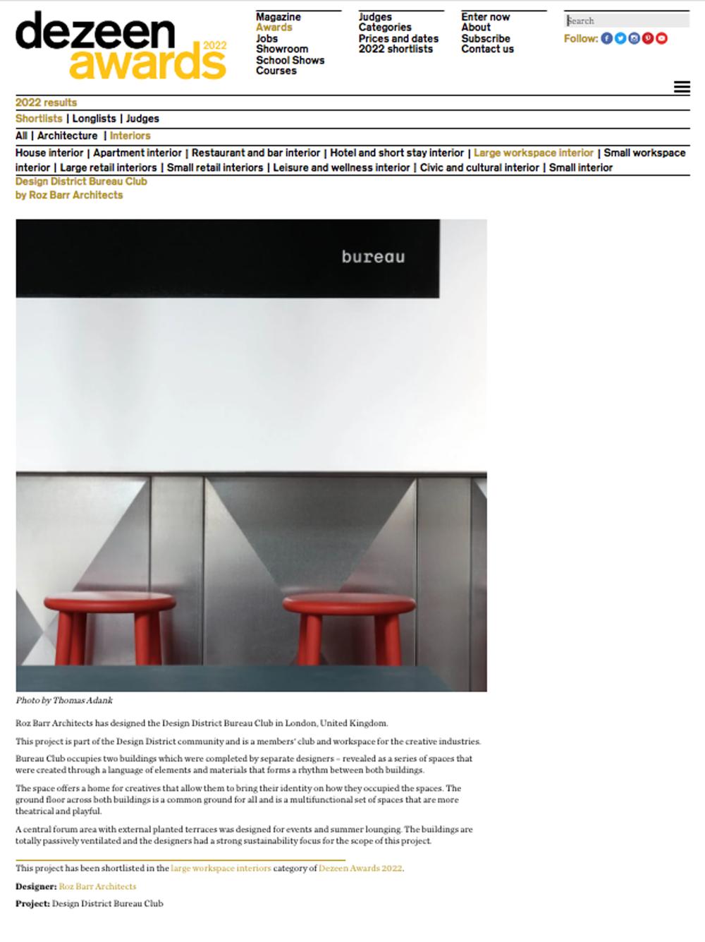 RBA shortlisted for Dezeen Award 2022 for Design District Bureau Club