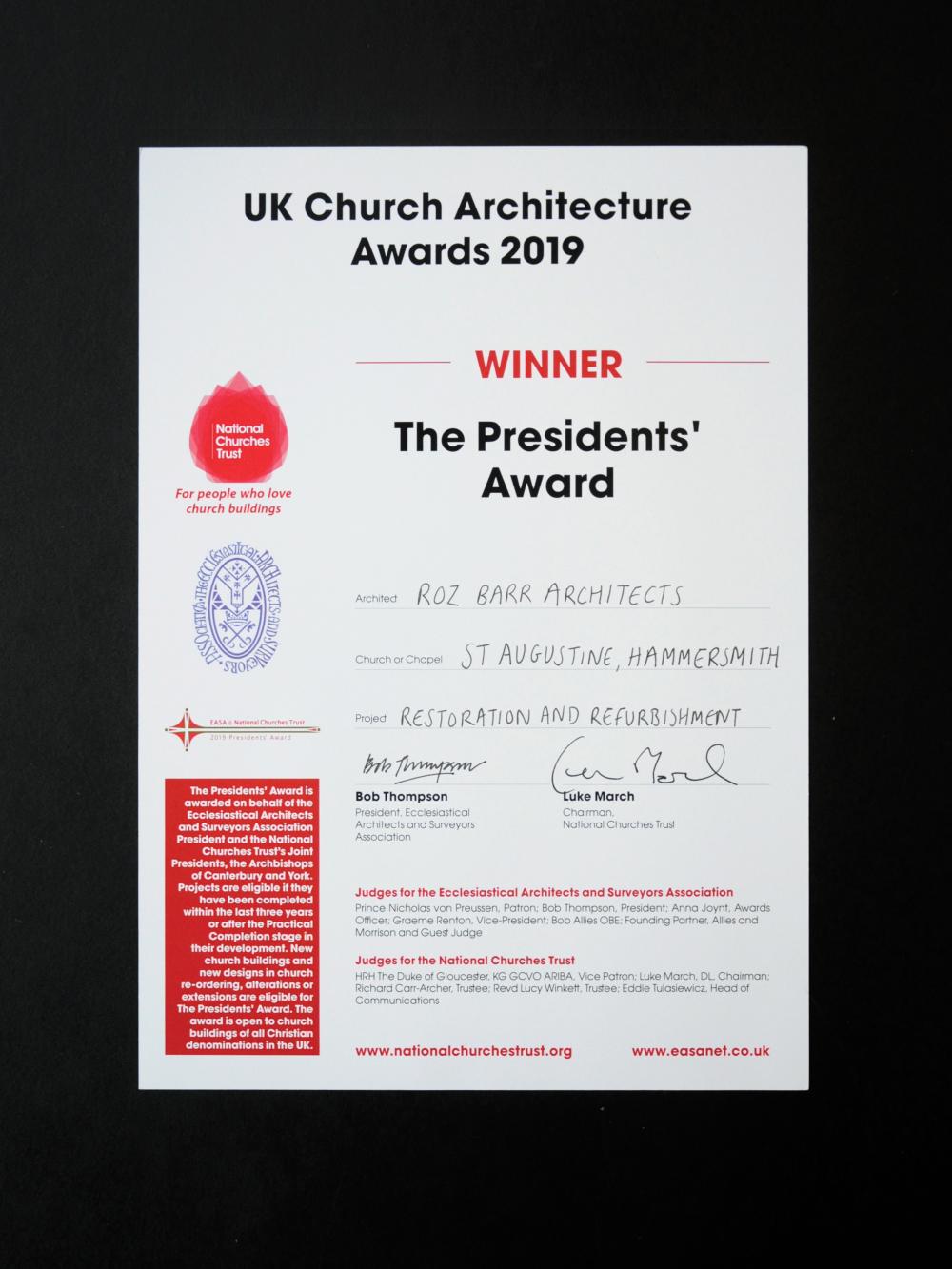 Roz Barr Architects is pleased to announce they have been awarded The Presidents’ Award for the refurbishment and restoration of St Augustine’s Church, by the UK Church Architecture Awards 2019.