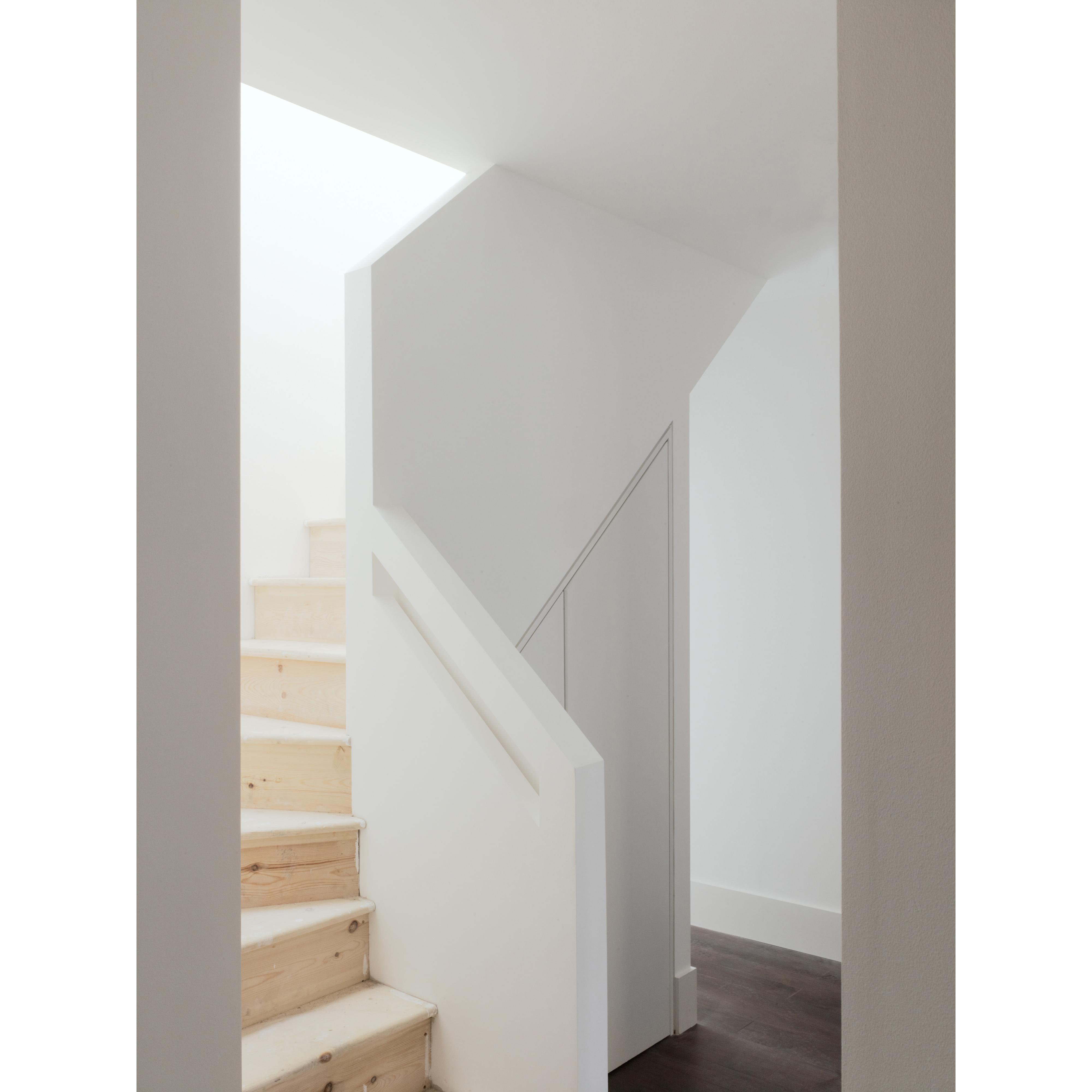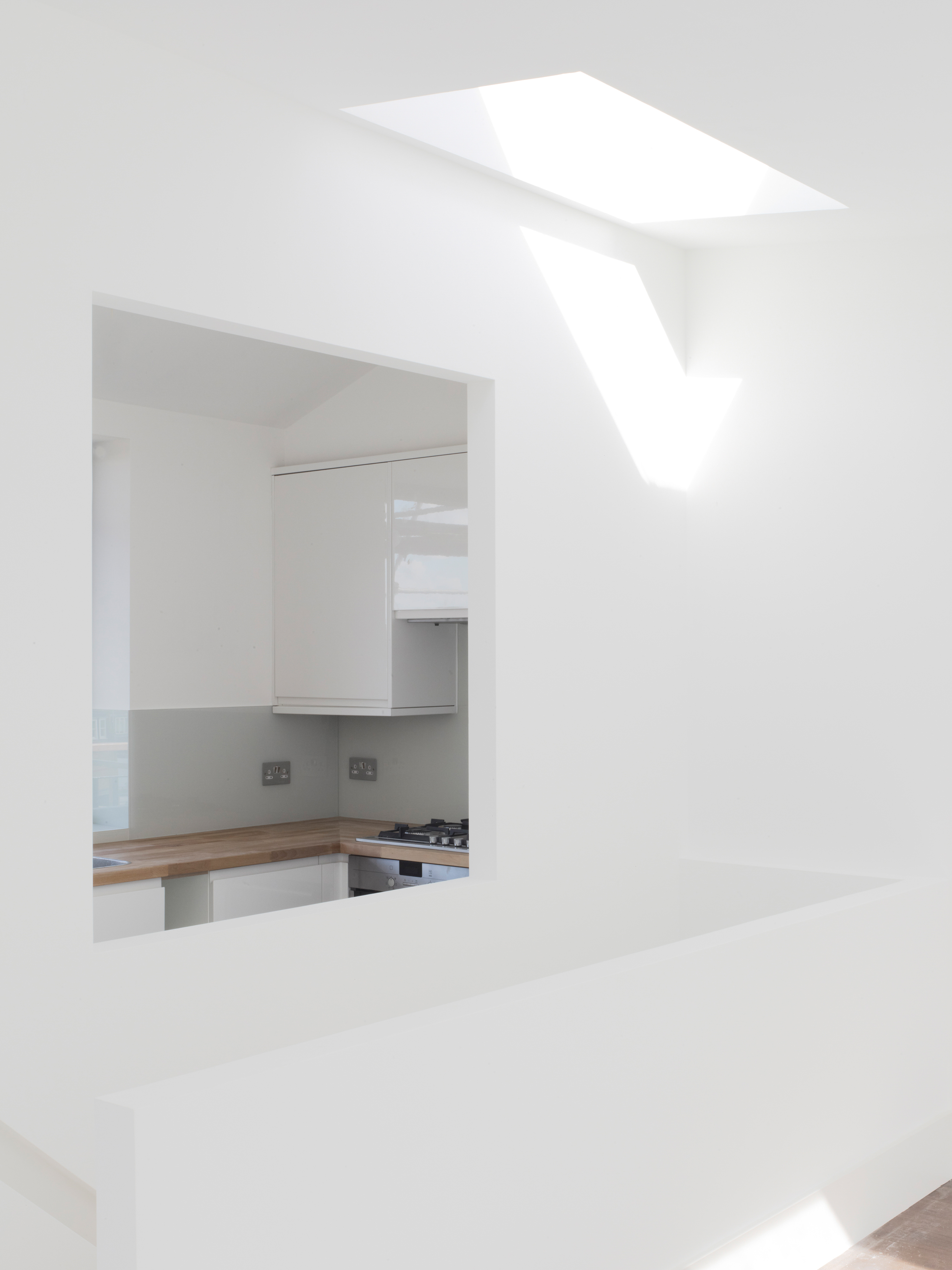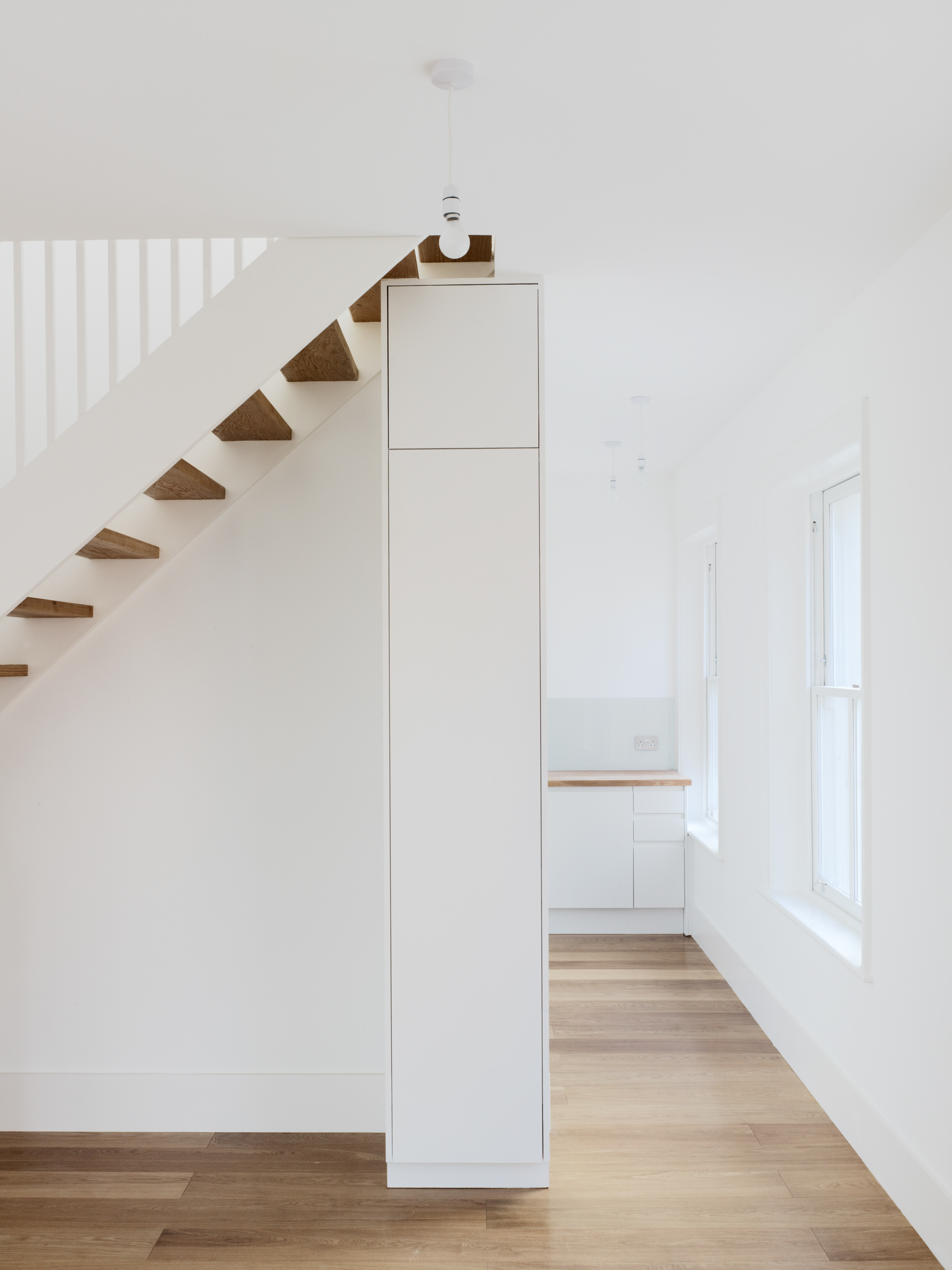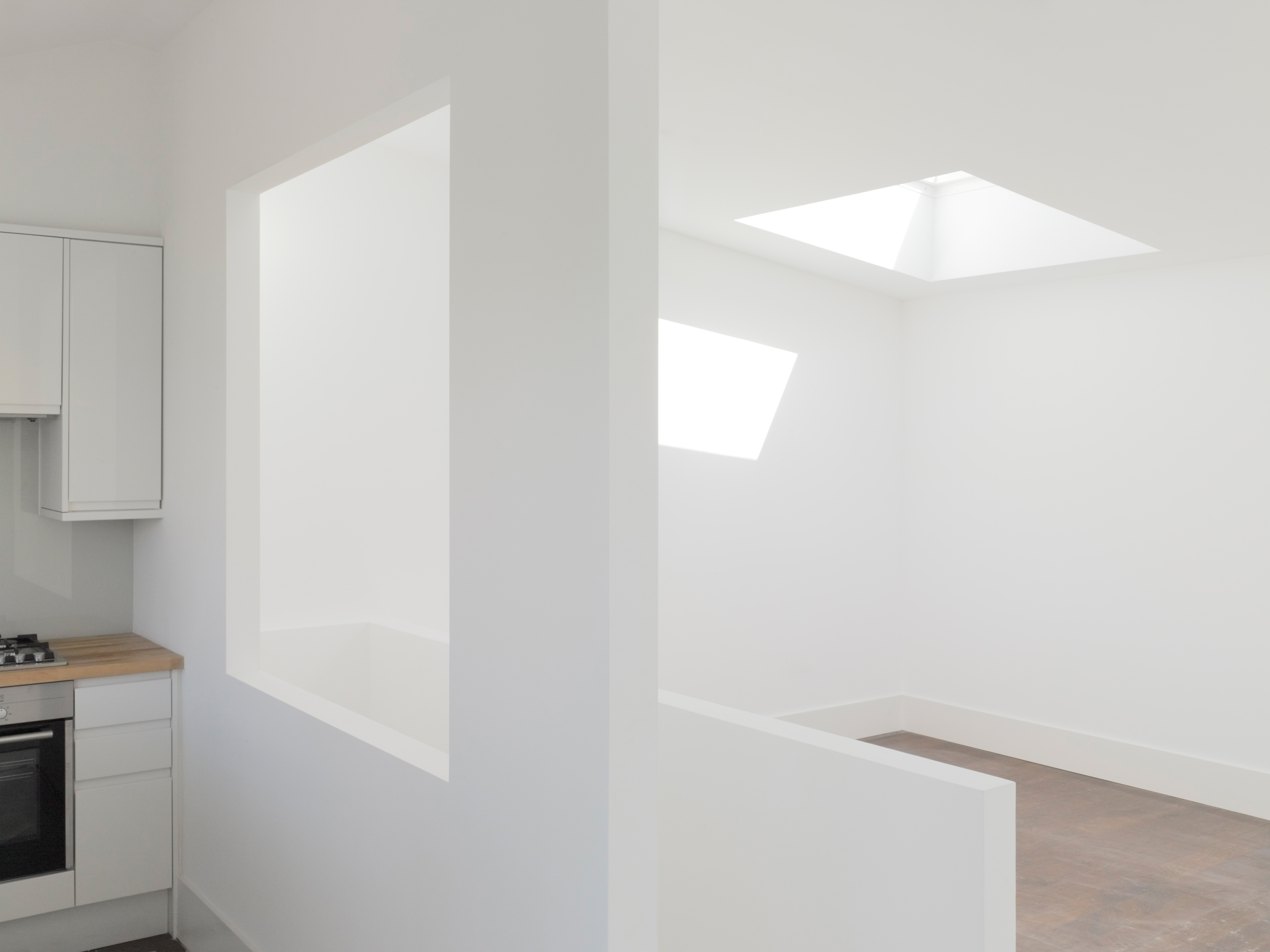 A successful planning application allowed us to extend the building by one storey thus allowing for two new apartments at the first floor level with duplex apartments above. The new storey sits behind an unusually high parapet which meant that top lit spaces were necessary for the upper level. A new folded dark metal box is built behind a rendered facade, revealing its form with punched windows to the rear elevation.