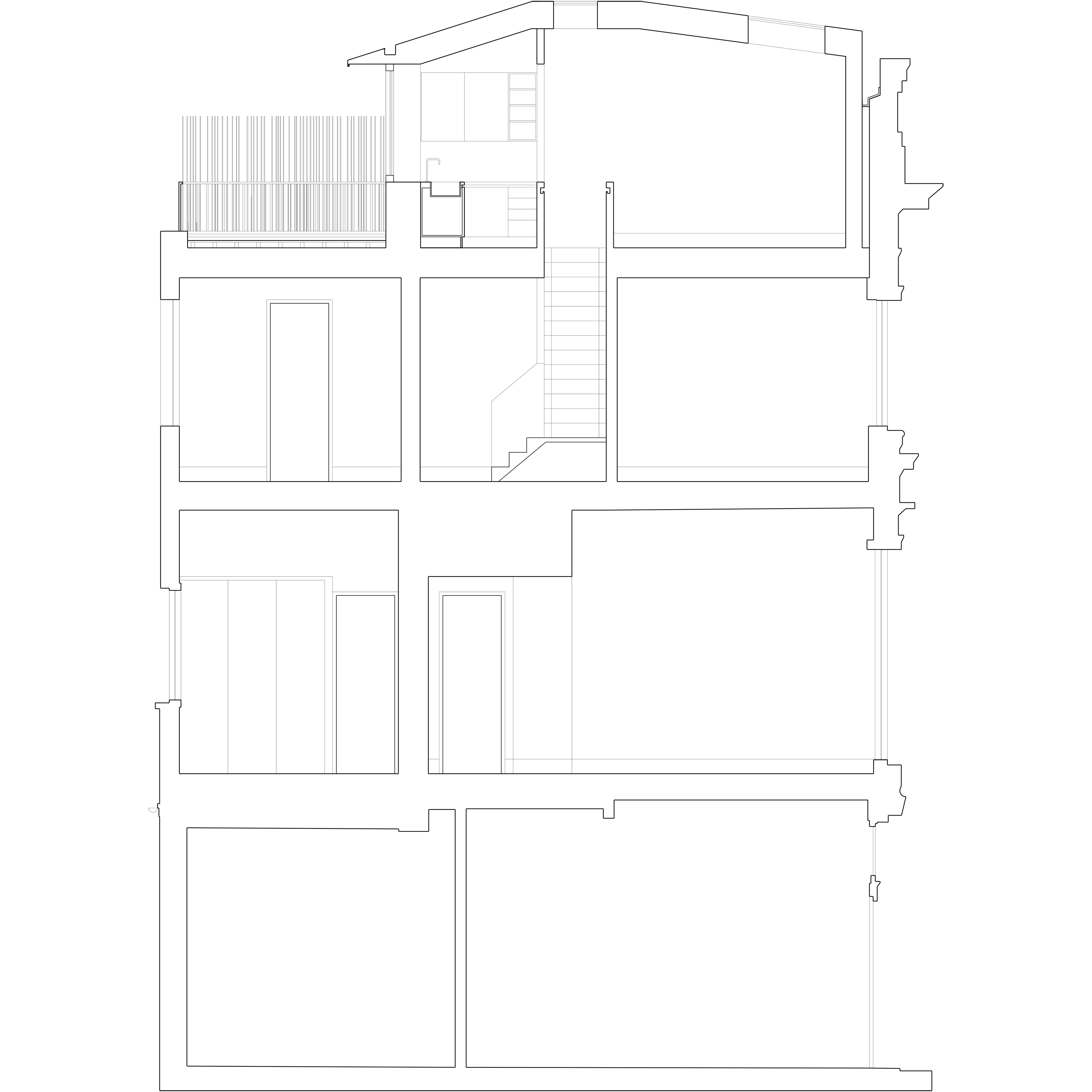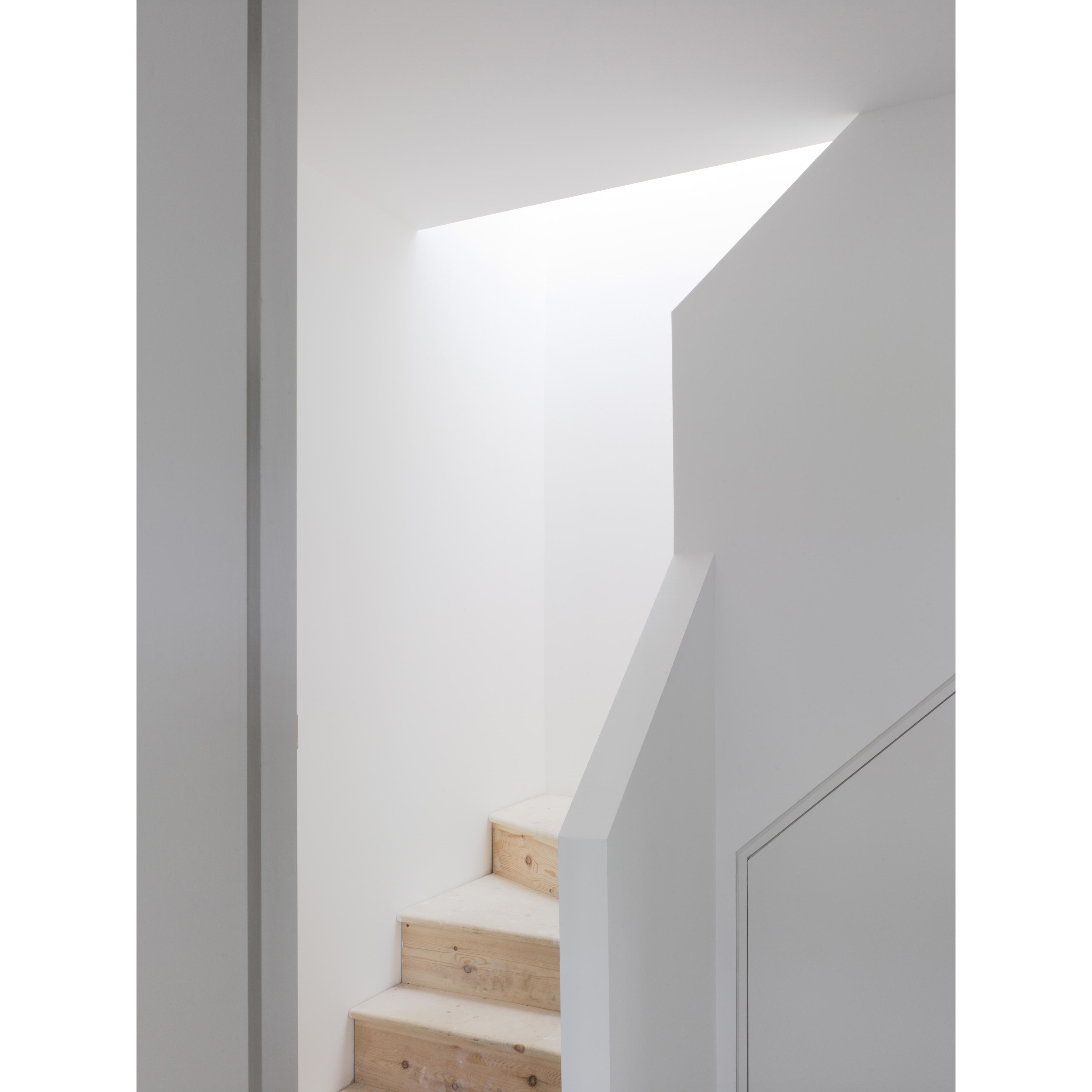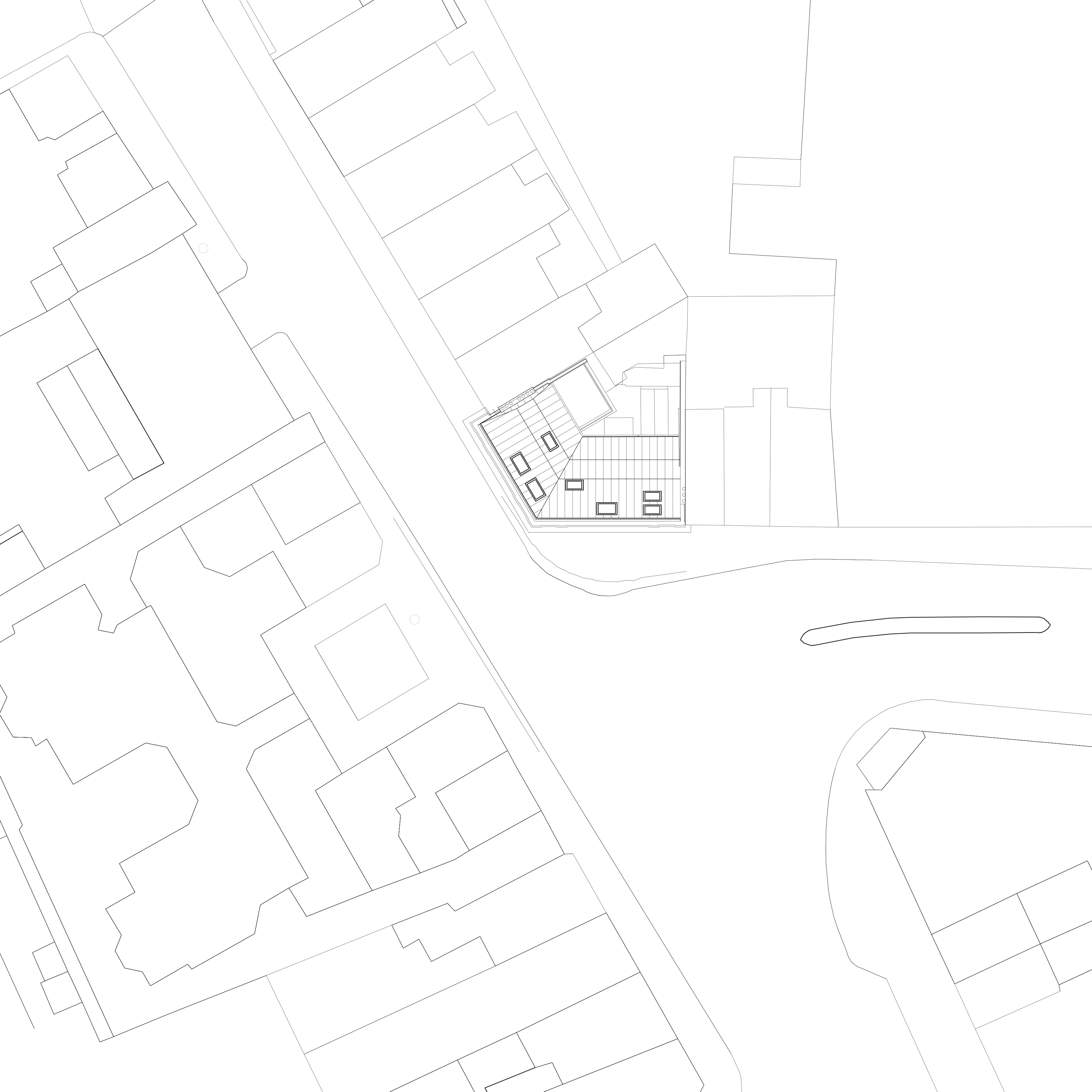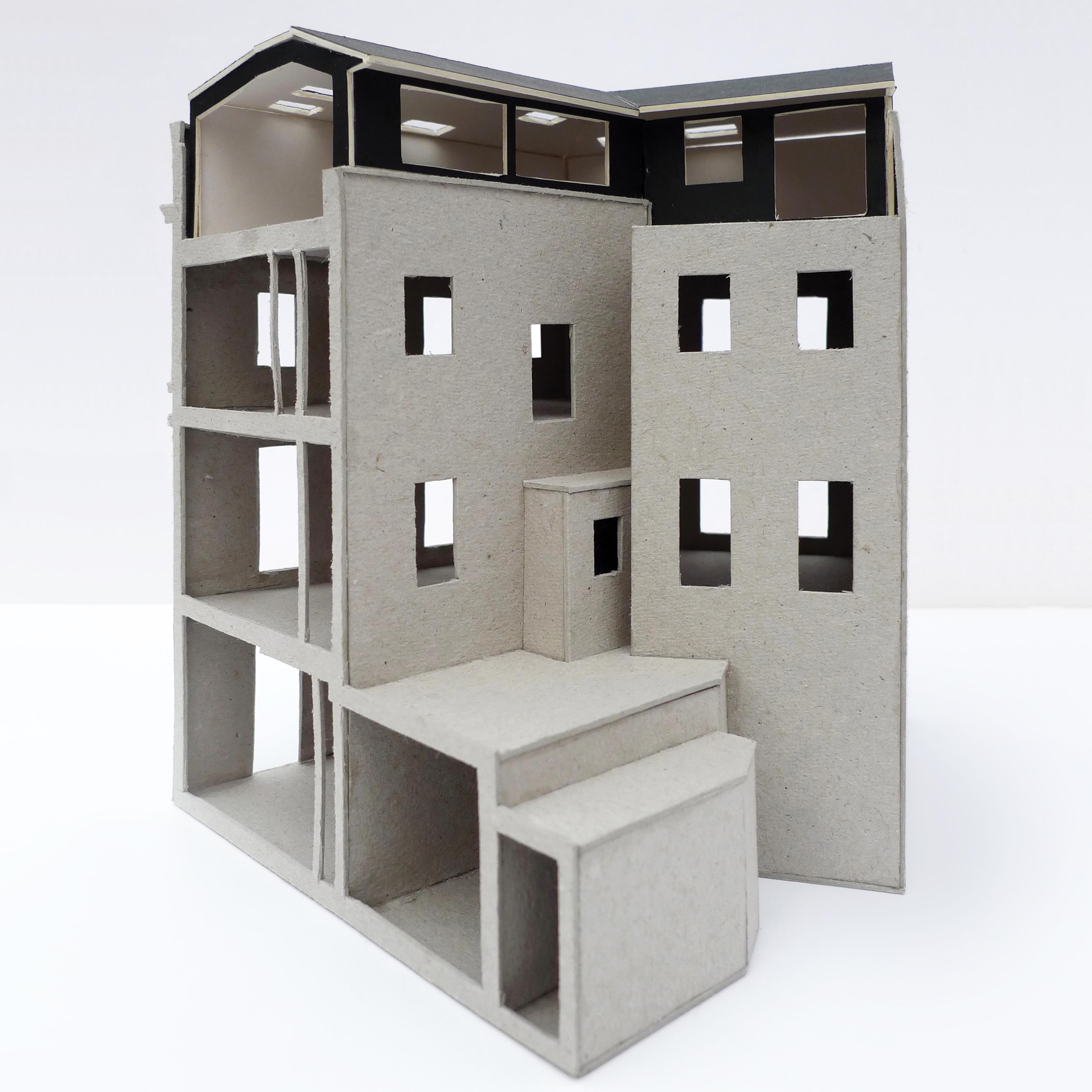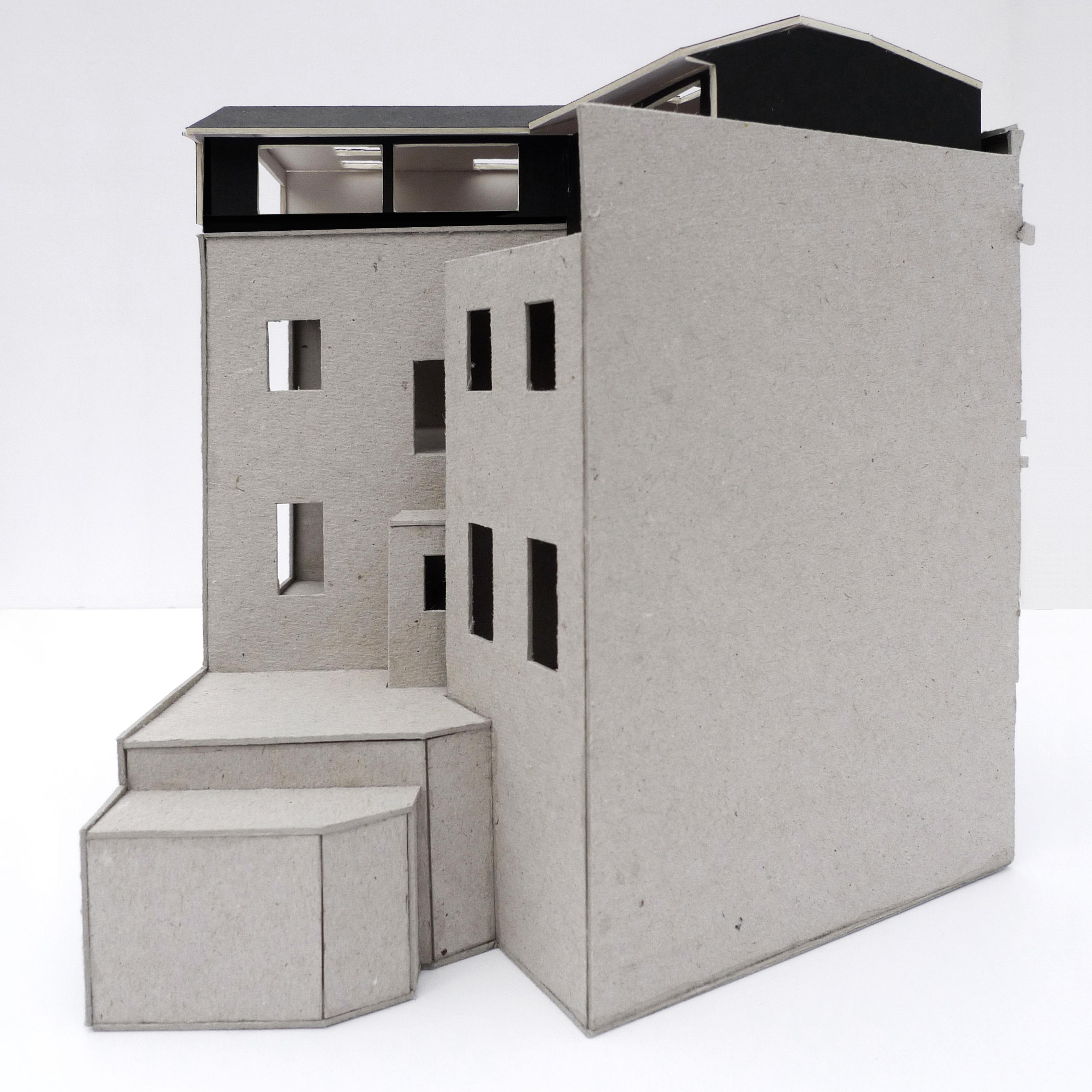 A successful planning application allowed us to extend the building by one storey thus allowing for two new apartments at the first floor level with duplex apartments above. The new storey sits behind an unusually high parapet which meant that top lit spaces were necessary for the upper level. A new folded dark metal box is built behind a rendered facade, revealing its form with punched windows to the rear elevation.