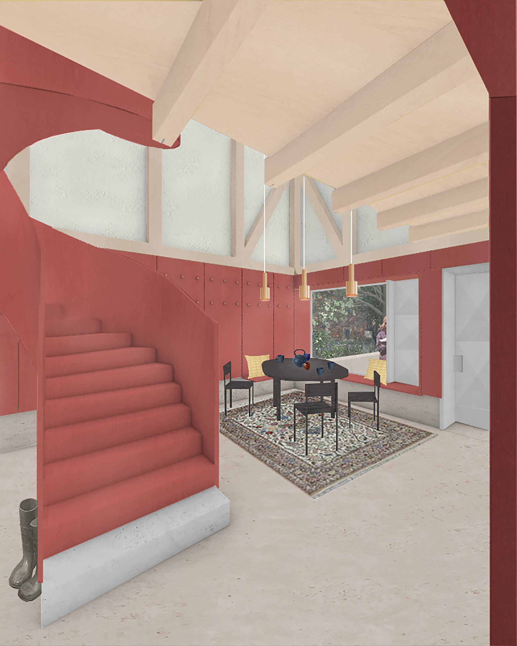 The interior of this new pavilion is clad with stained timber panels to offer a warmth to the masonry skin. We propose to line the internal structural timber frame with a deep red wood-stained panels and cabinets. The linseed oil stain will be very durable and will not fade in colour. This will accommodate a workspace and tool storage, and a meeting area and drying room for staff. We have integrated a kitchenette and also a large handwashing trough. The space is fully insulated using Hempcrete blocks and will be heated using localised electric matts to floors and walls. There is an opportunity to use an air source heat pump that could be located within the plinth and offers an efficient heating source. Cross ventilation is provided by openable windows and shutter boxes and the staircase provides natural light to the tower and ventilation through side panels in the roof. Rainwater is directed through a gargoyle to the north elevation and will be collected in a large water butt.