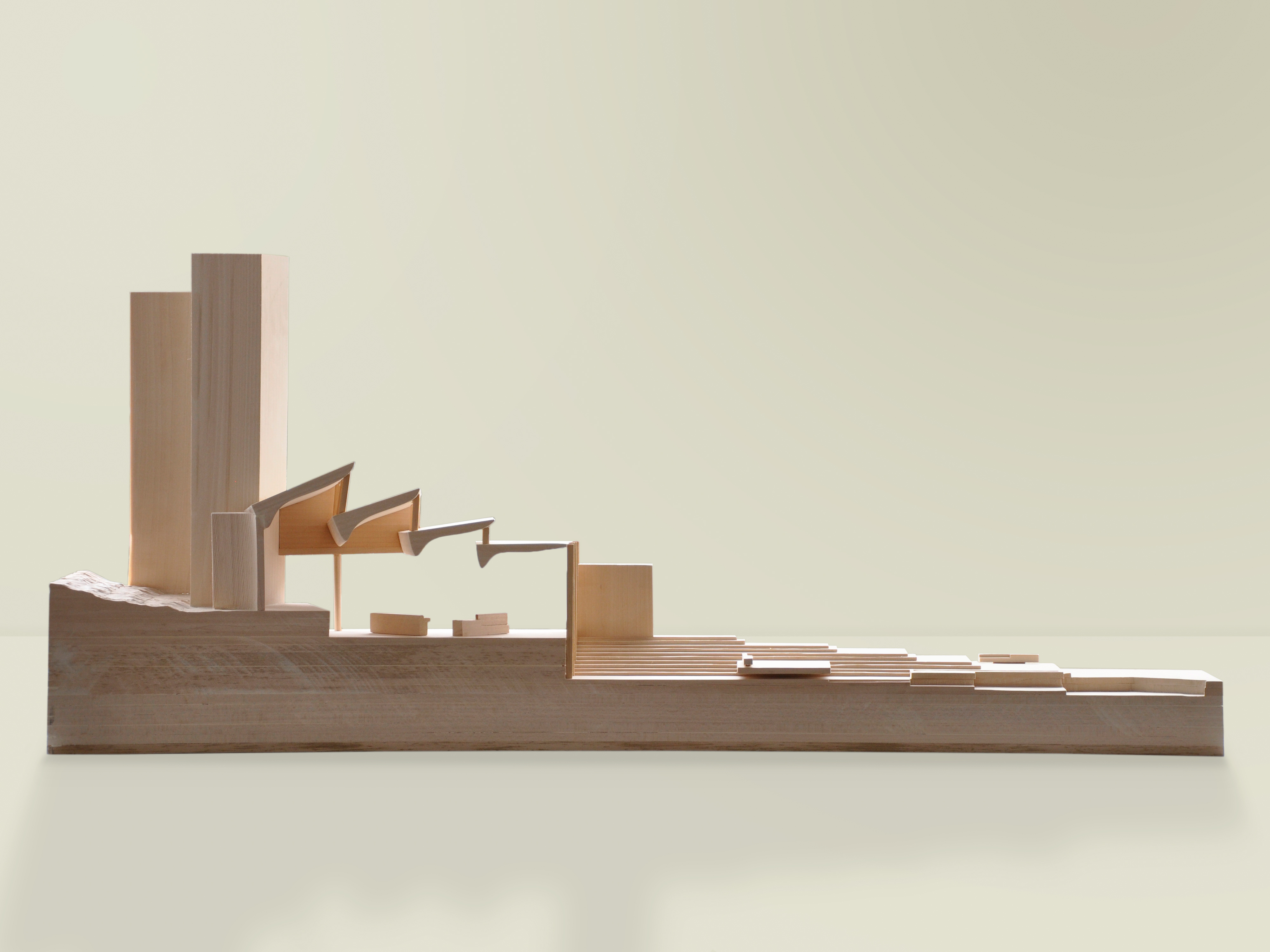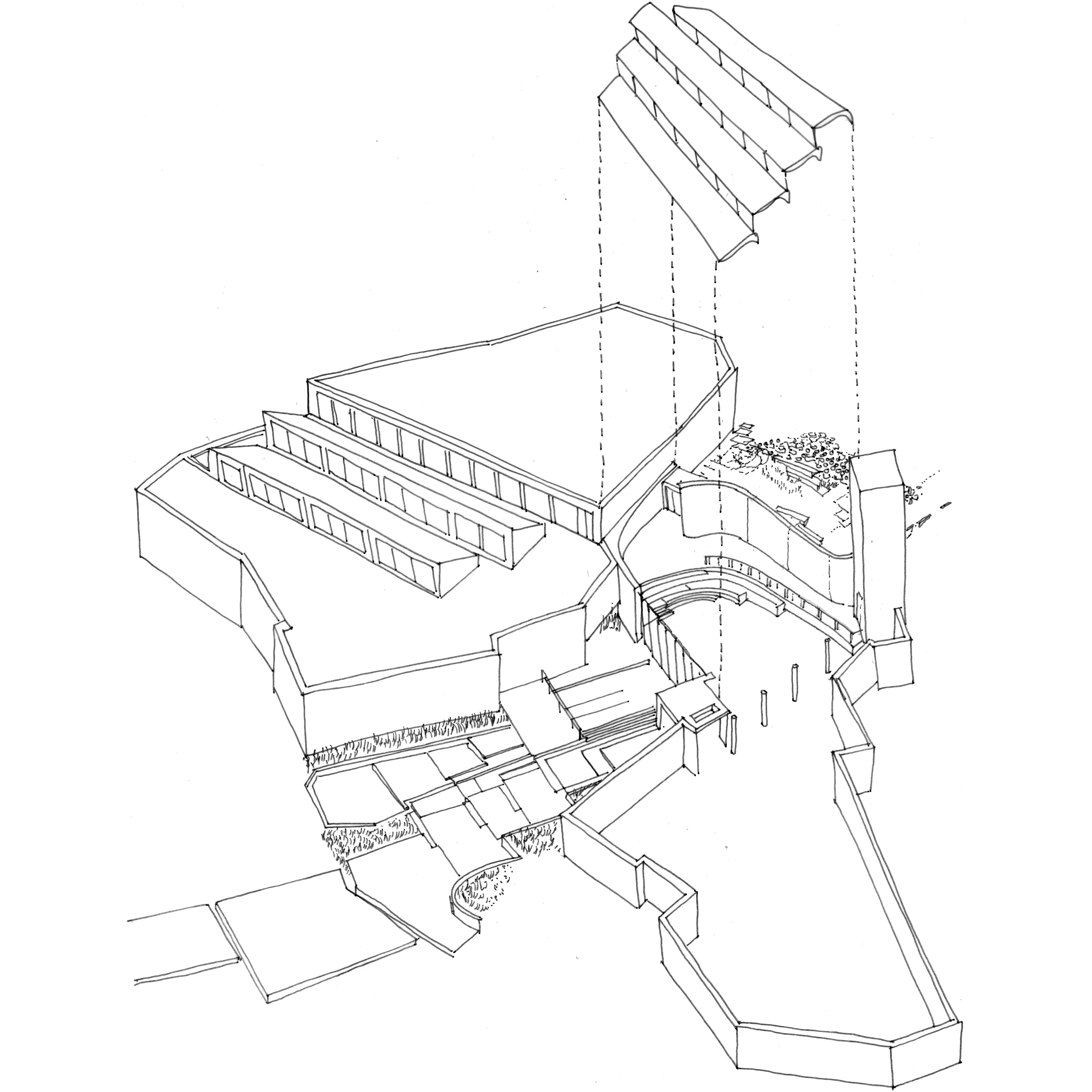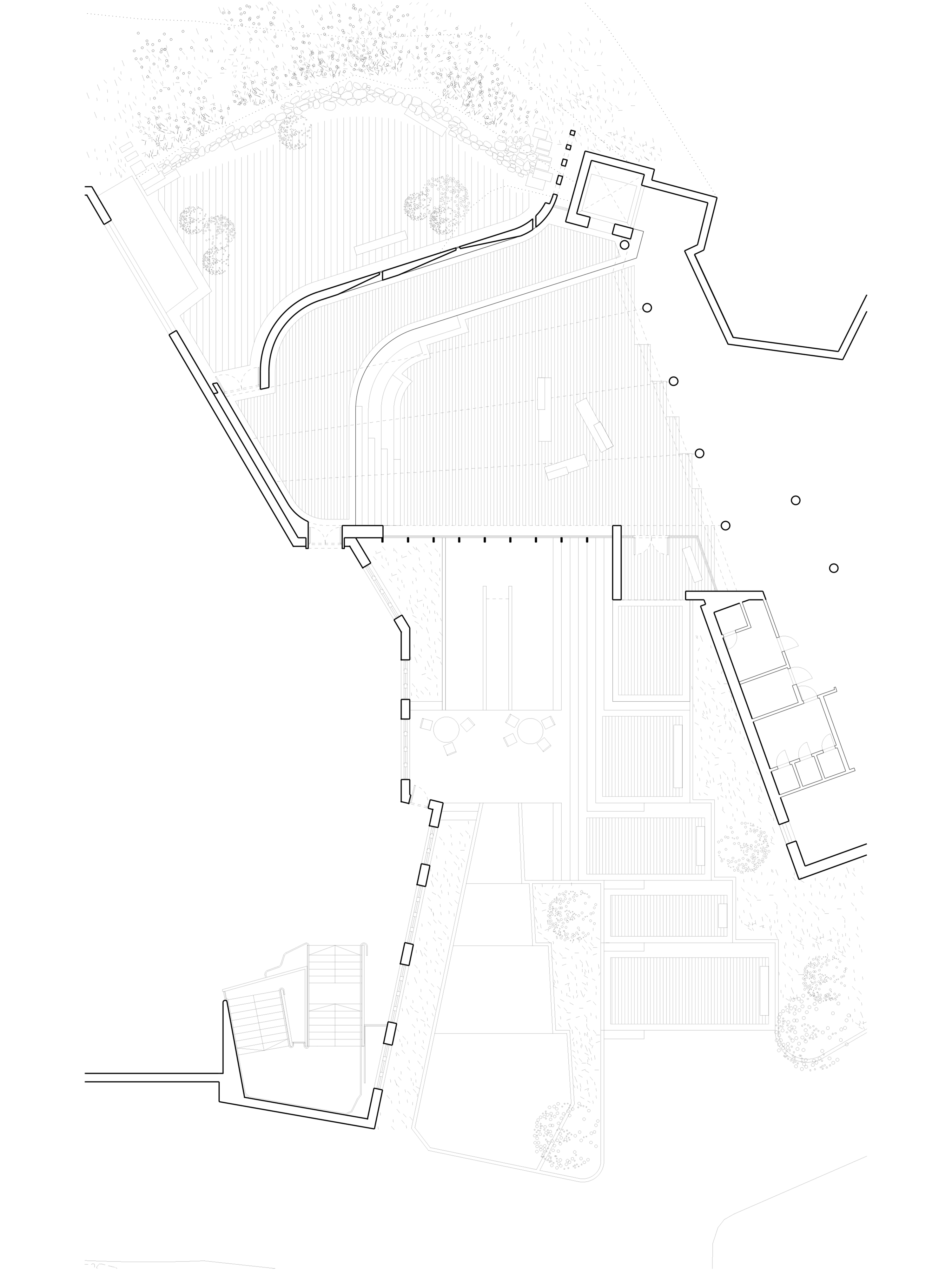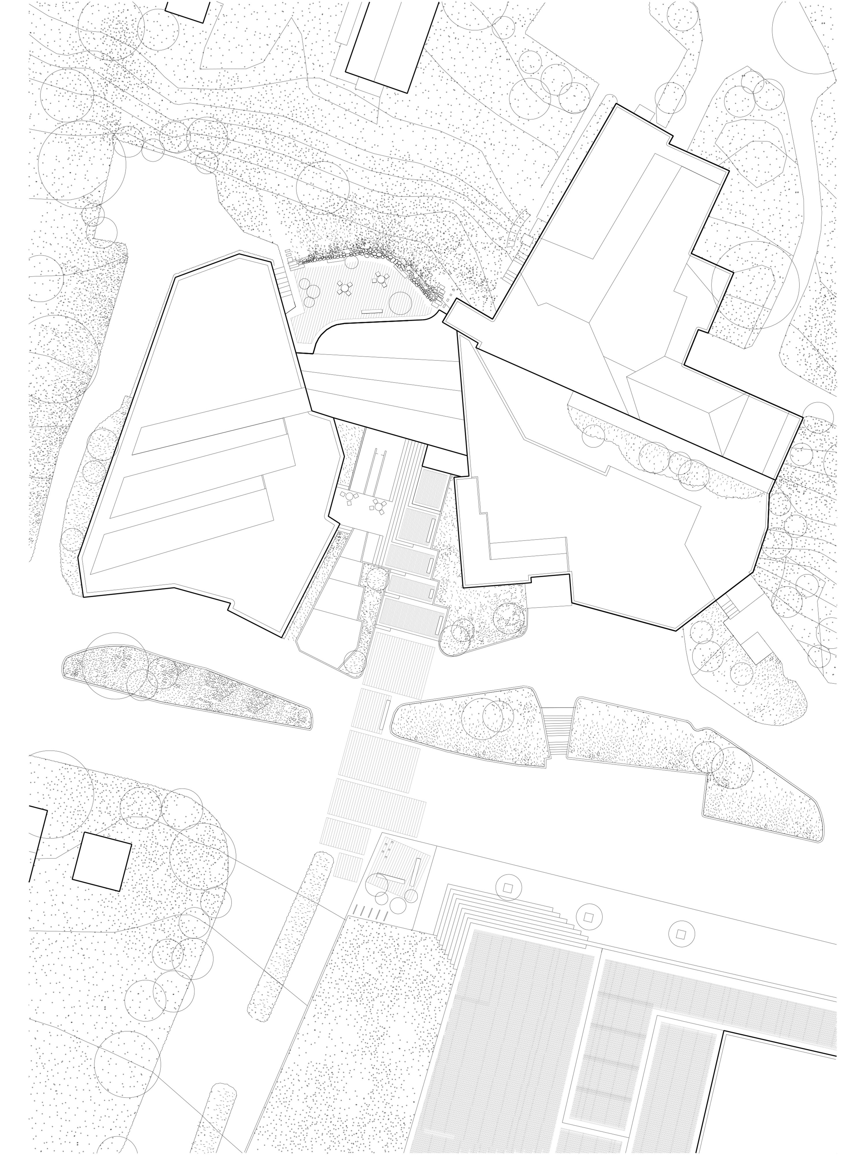 Our proposal offers a new connection between The Museum of Cen- tral Finland and the Alvar Aalto Museum to create a new public space between the existing buildings. Our approach is to create a new ex- tension that allows for a harmonious transition between these beauti- ful Aalto buildings. Our proposal was to unite both the existing Aalto buildings in section but also the intention to offer a stronger visual connection between the museums and their relationship to the mas- terplan and Ruusupuisto Square. The idea of creating a continuous surface that bridges the approach from Ruusupuisto Square through the new extension and to a more private courtyard that is nestled in the existing landscape unites Aalto’s theory of how boundaries be- tween nature and artificiality, between the interior and exterior of the proposal can be united.