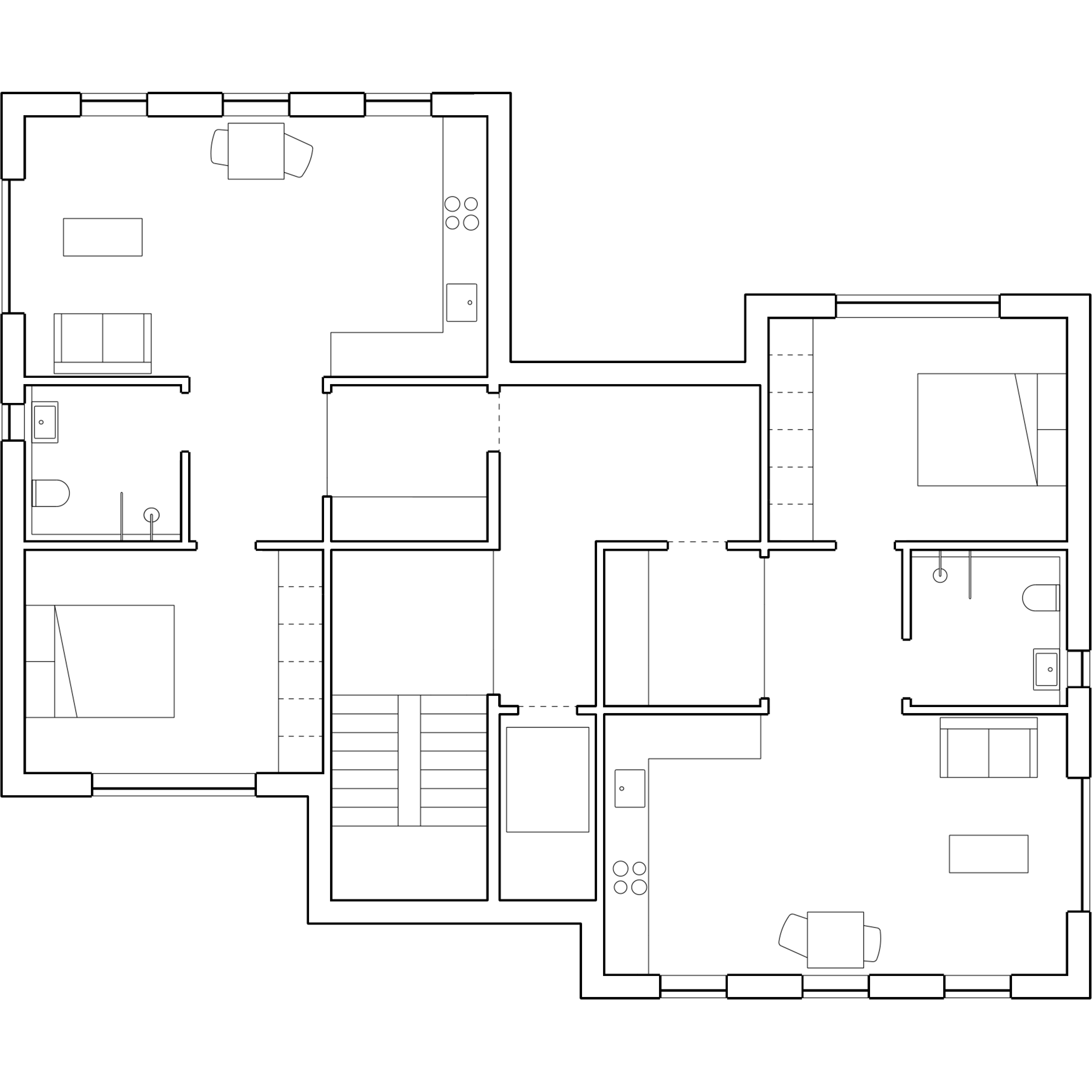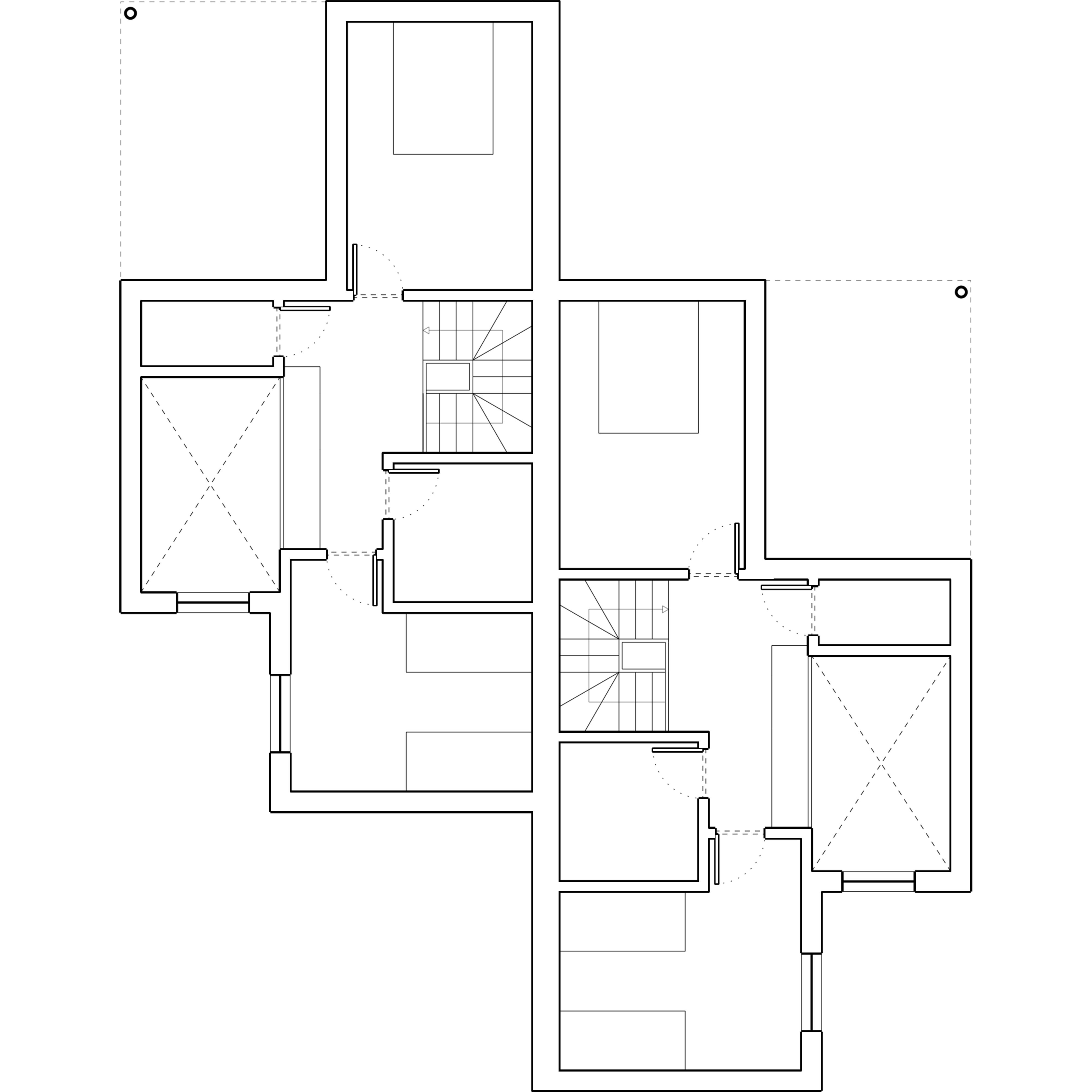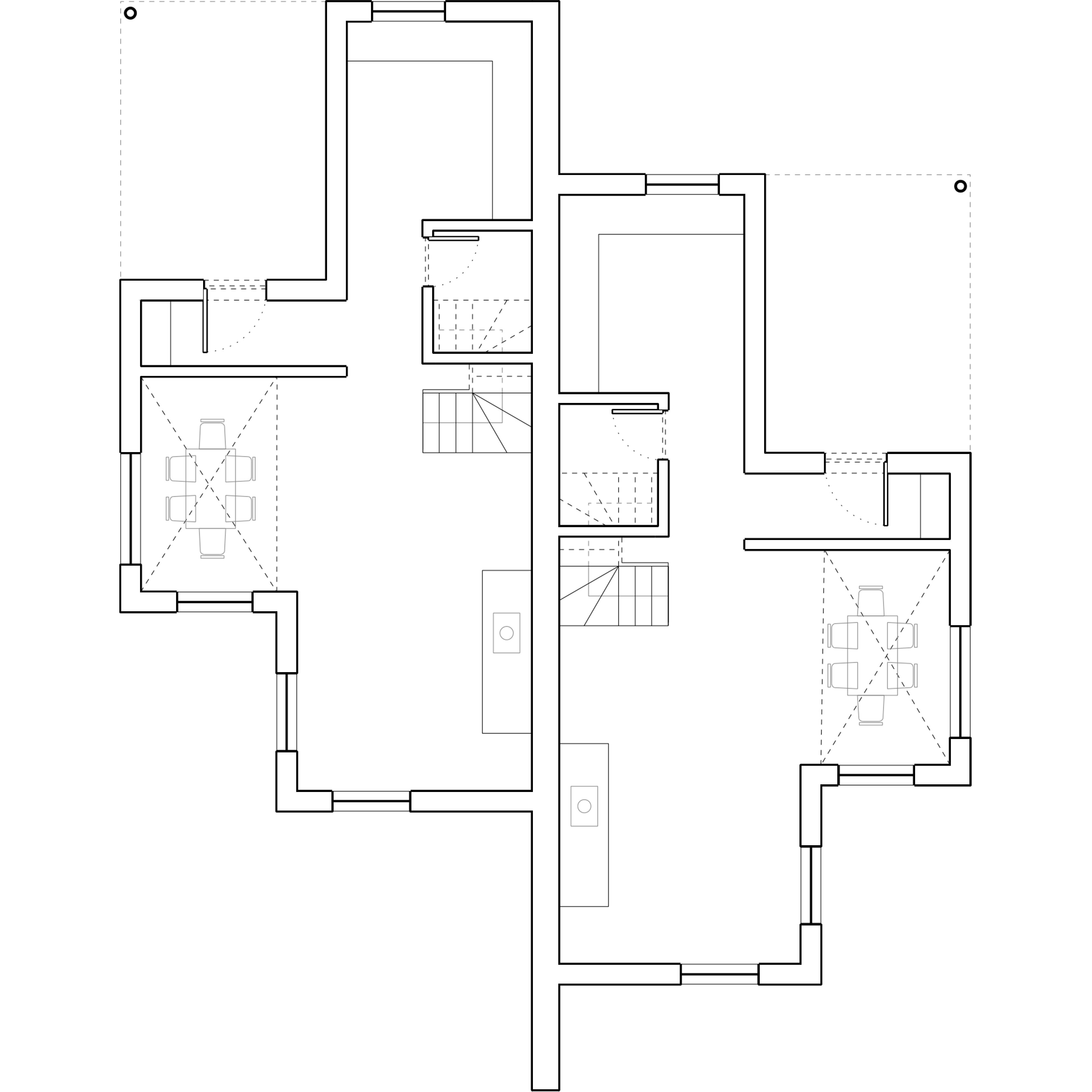 The two-bedroom semi-detached houses site to the west of the site on the higher ridge of the site. These share a central spine wall where all the services will be shared. The ground floor plan is accessed from a covered vestibule that could in the future be enclosed to offer an additional room. The dining area is double height and could be a workspace during the day but we have created a double height space with a work bench above the dining area making use of the hallway at the top of the stair. A large window will provide a well-lit space and to views across the fields.
