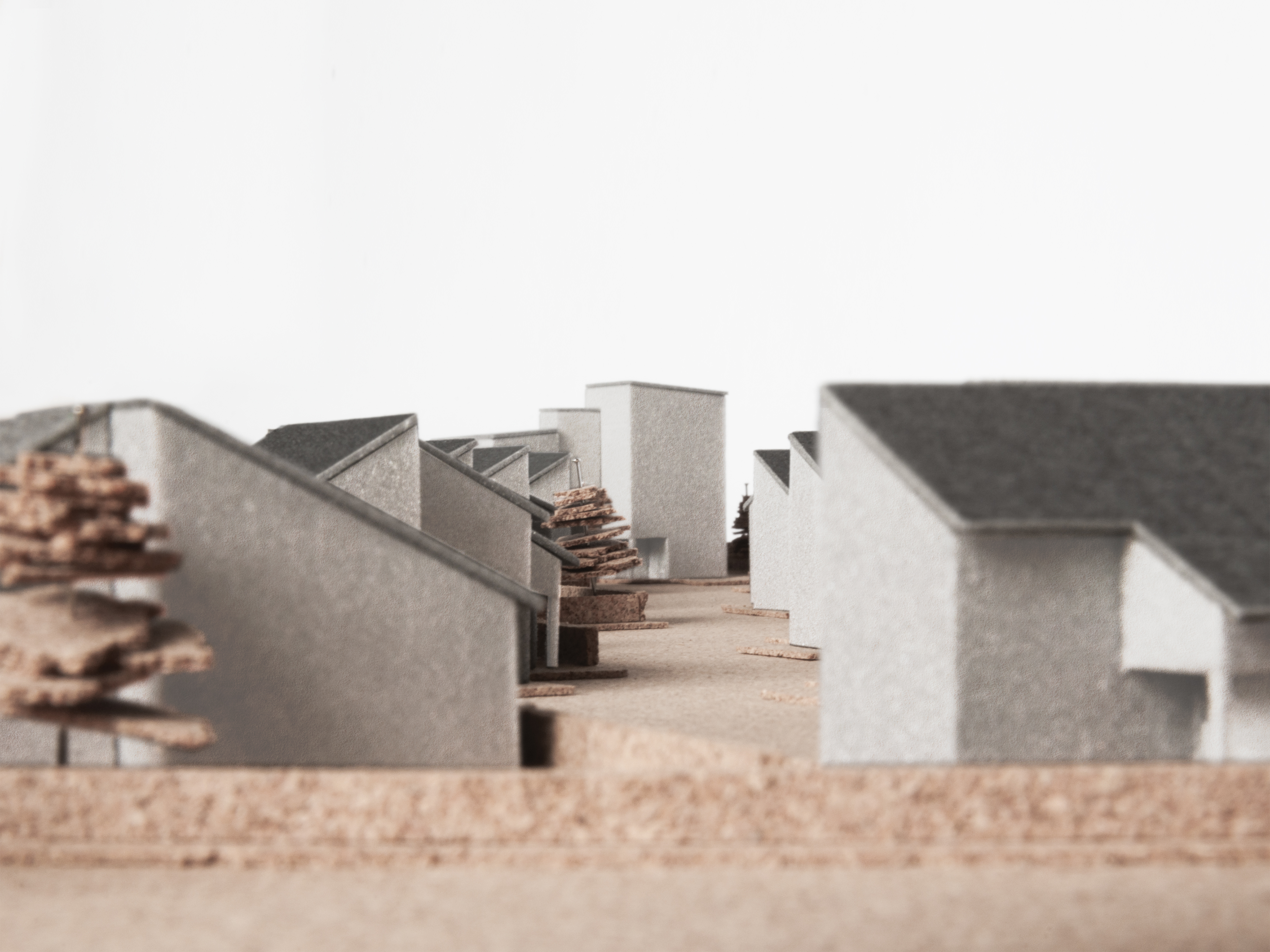 We are proposing simple material palette of a textured white render with a concrete base. The houses will be constructed of blockwork with structural timber will form the roofs with a dark grey roof tiles. We are proposing a cavity wall with Cellulose insulation which is recycled paper, which is a sustainable approach and has a higher fire resistance than most fibreglass insulation and will perform well to meet excellent U Values.