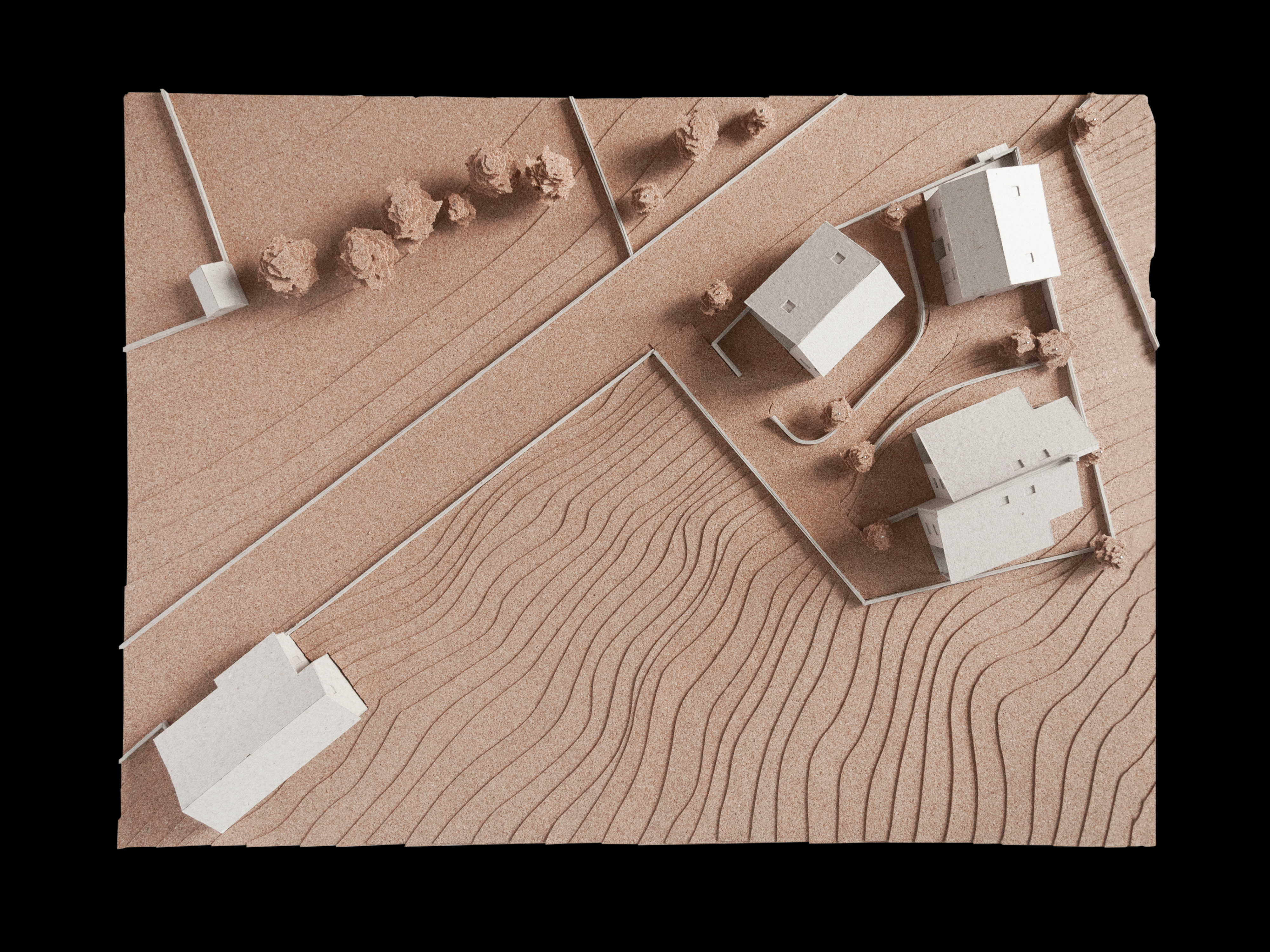 We have retained the slope to the site by stepping the houses into this bank. The two 3 bedrooms houses like the barn further the B4679 so these three forms, similar in scale read together. They both form an edge to the site and we have used the language of the dry stone wall as a basis for the proposed palette. The proposal offers a new road being formed to the north of the site which leads into the cul-de-sac around which the four houses sit. This new entrance road could be extended as the development grows and form the main route as the development grows. We have pulled back the wall at the entrance for greater visability onto the B4679. We would position the incoming services and connections for waste at this entrance.