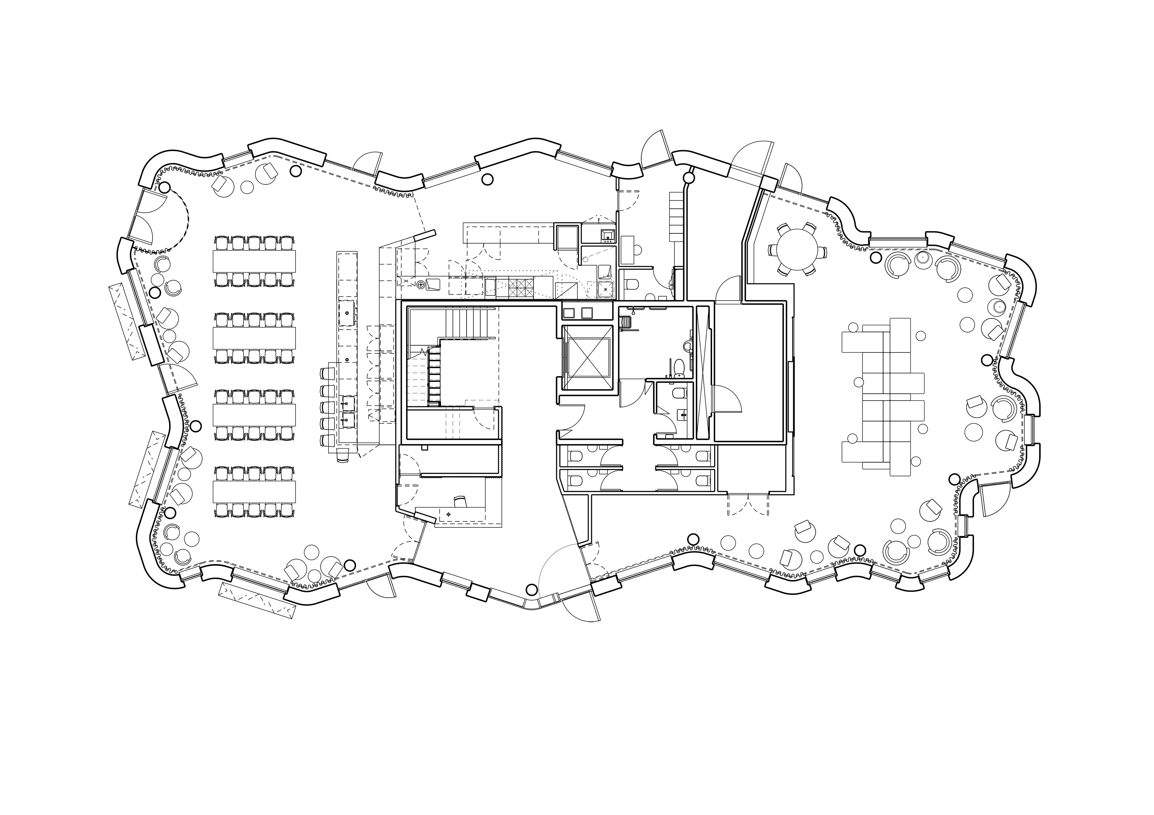 Within our proposals we are creating the main restaurant for the Design District with a coffee bar and lounge areas. There are a range of different sized meeting and conference facilities. We have created new hot desking floors with central coffee bars, phone booths and Zoom-meeting rooms. There are also floors of fixed desking for permanent members with similar break out areas and we have designed all of the joinery and bespoke furniture. We have developed a new concept for flexible studios that vary in scale and can be adapted for short term tenancies. A central forum space with external planted terraces was designed for events and summer lounging. The buildings are totally passively ventilated and we have a strong sustainability focus for the design of this project.