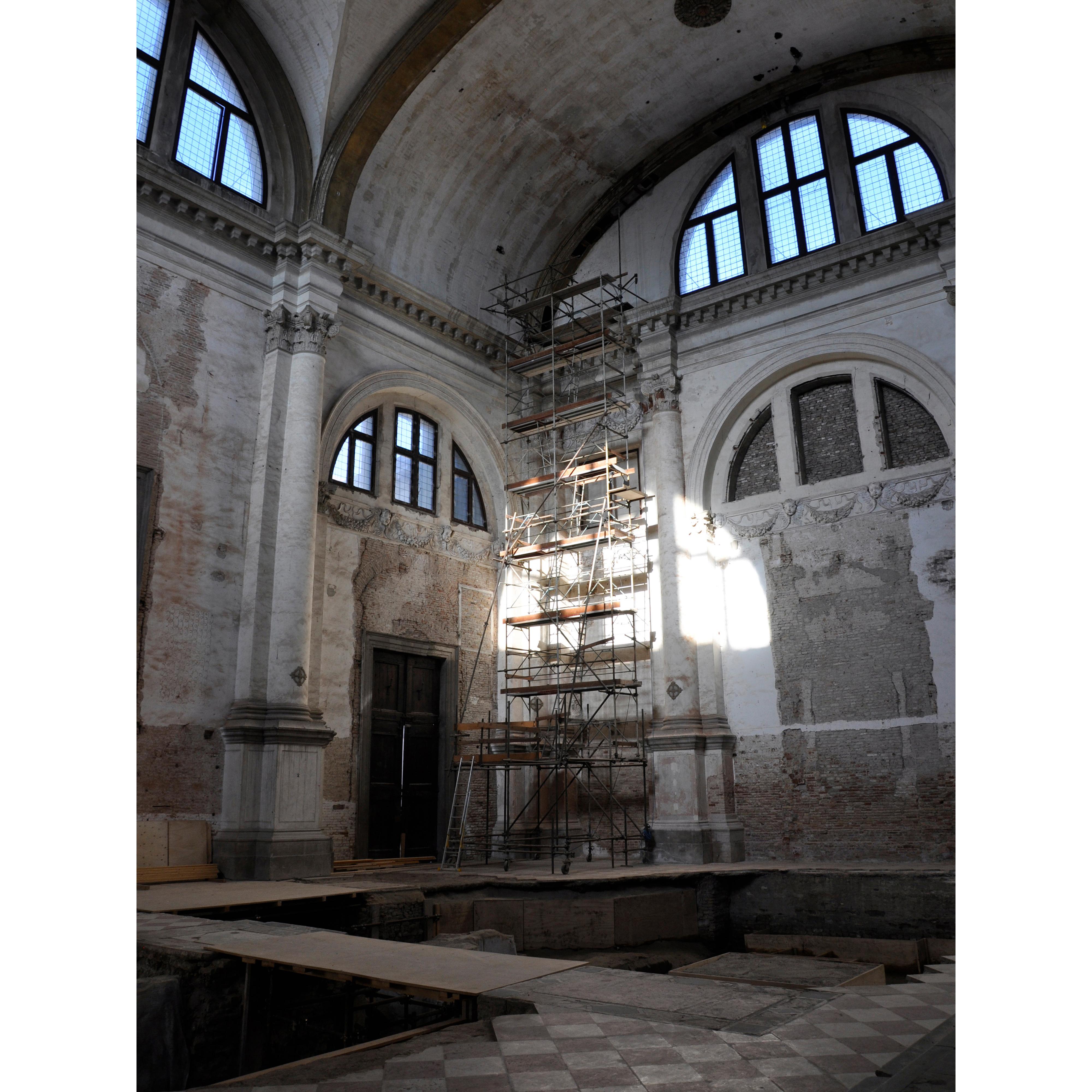 The remarkable and weather worn brick facade of San Lorenzo appears as an eternal project, perpetually awaiting its stone cladding. It has towered over the campo for five centuries, and stands today as a notorious example of Venice’s gradual decline. A cavernous archaeological ruin in the heart of Venice, its excavated floors reveal the foundations of successive churches from the 6th century onwards. That the disused church has remained completely closed to the public for many decades (in spite of various plans to occupy it) is a testament to the city’s limited finances, its overcomplicated politics and, perhaps, its tendency for a nostalgic approach to its crumbling buildings.