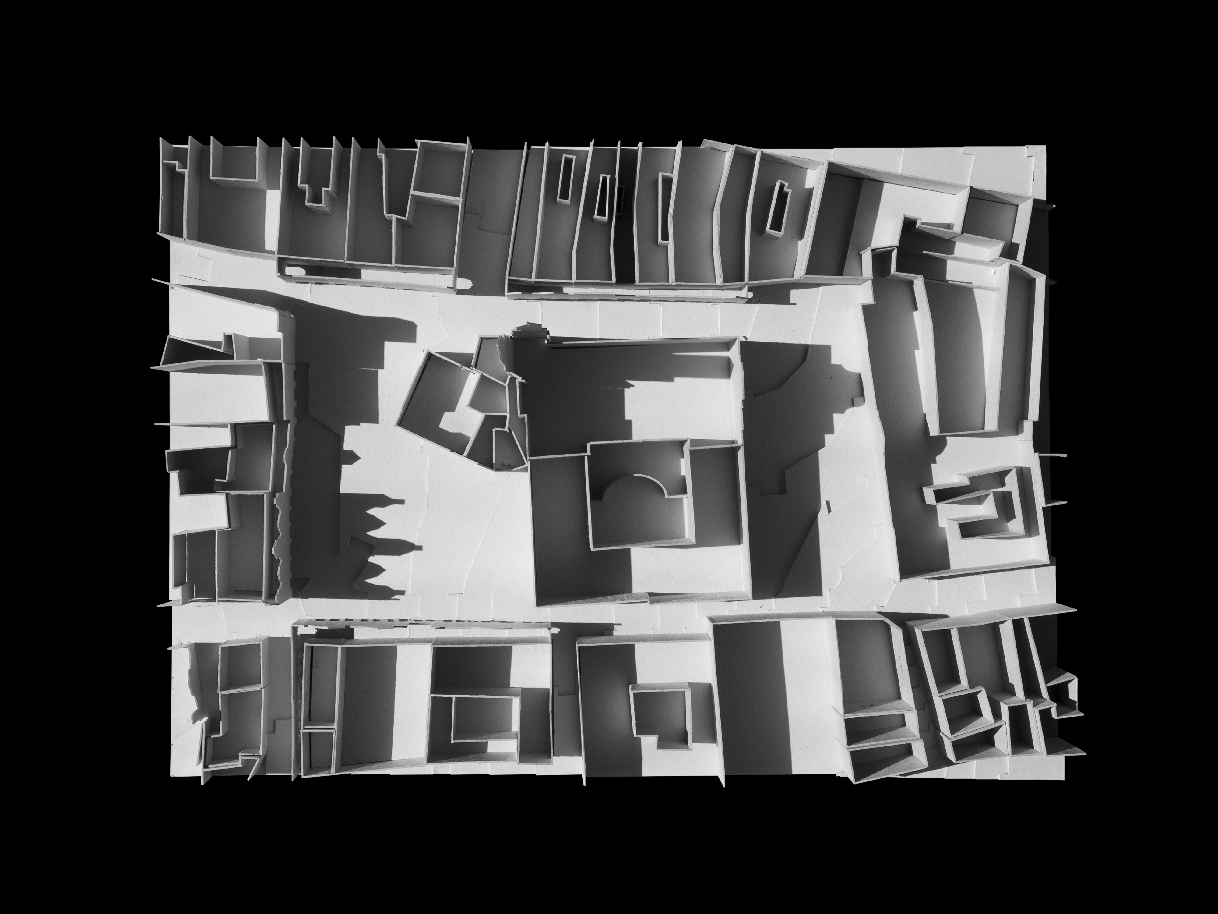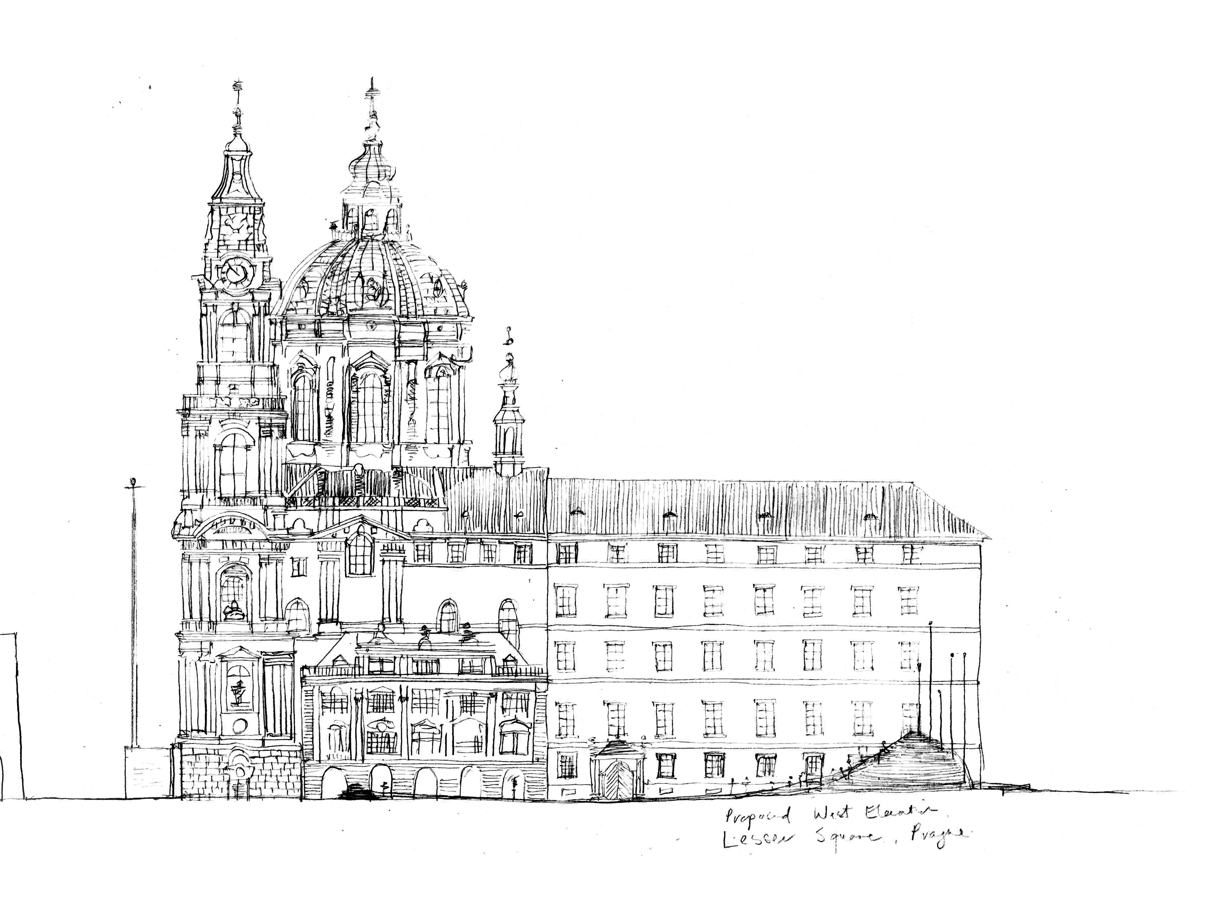 The lower square removes the existing Burgher House and relocates this in the landscape and hill of Prague, Schoenbornska Zahrada. The ambitious proposal opens up the pedestrian movement from the west and creates an urban park. We propose to place a “hill” - a soft landscape of paving sets - where one can reflect and look beyond to the Burgher Houses and the public space. The area becomes a place for a market and for cafes to overflow. The remnants of the Burgher Houses are traced on the ground with the new paving pattern. The rear elevation of the Baroque Church is exposed forming a new frontage. It reaffirms a route and identifies the importance of the past, re-emerging as a folly in the landscape; a typology of the renaissance vernacular.