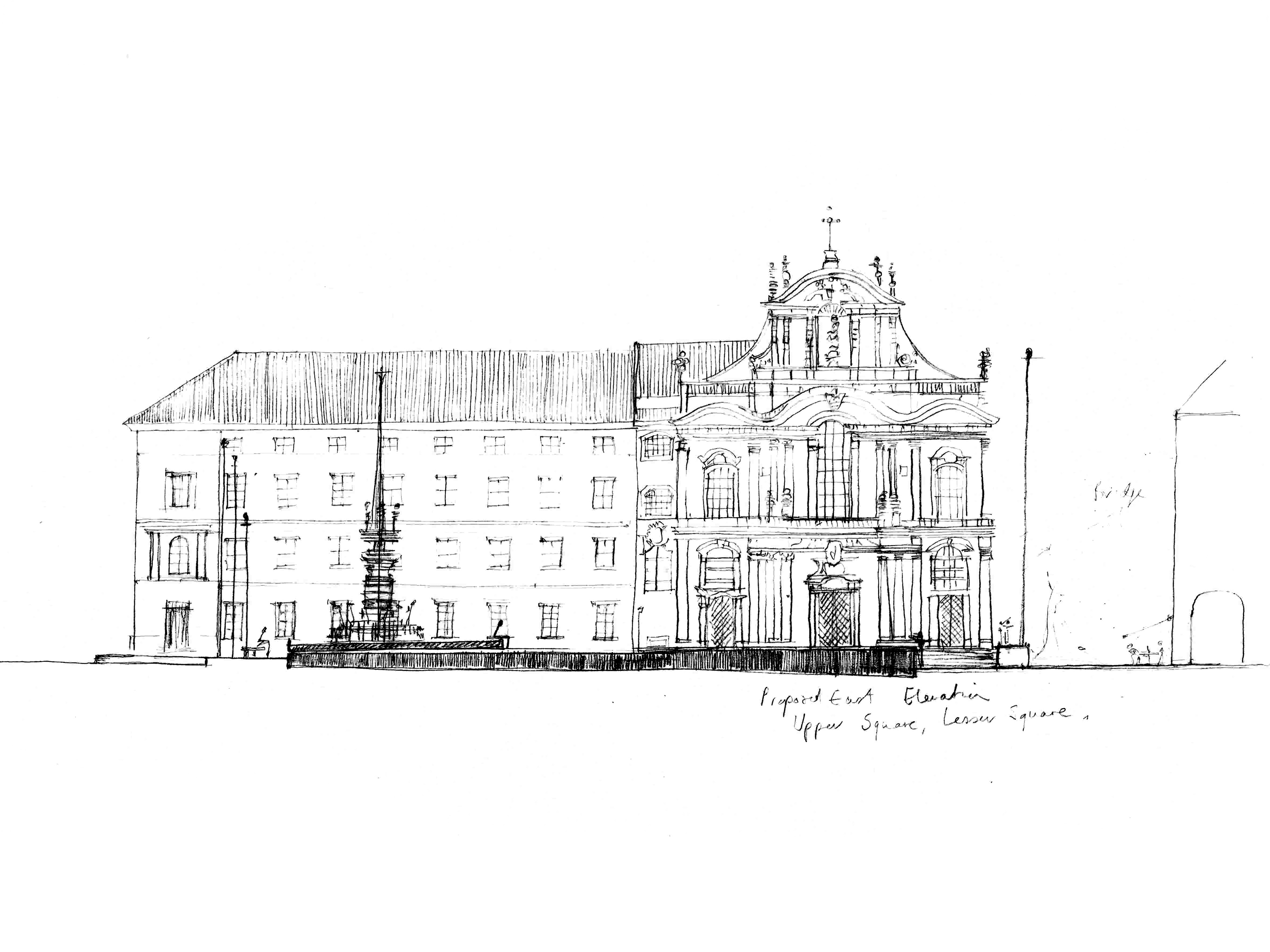 The upper square is proposed as a formal space with a pool of water which identifies and anchors the historic column to the area in front of the Baroque Church. A harmony of two linear elements - a pool of shallow water that reflects the historic column and a plinth that becomes the public performance space - provide structure to the square and deal with the level changes across the site. This will be an area for public gathering, performance for the church and the music school. It re-addresses the ordering of this grand and important church to the city and allows cafes and bars to the south elevation to spill out onto the newly extended and ordered public realm.