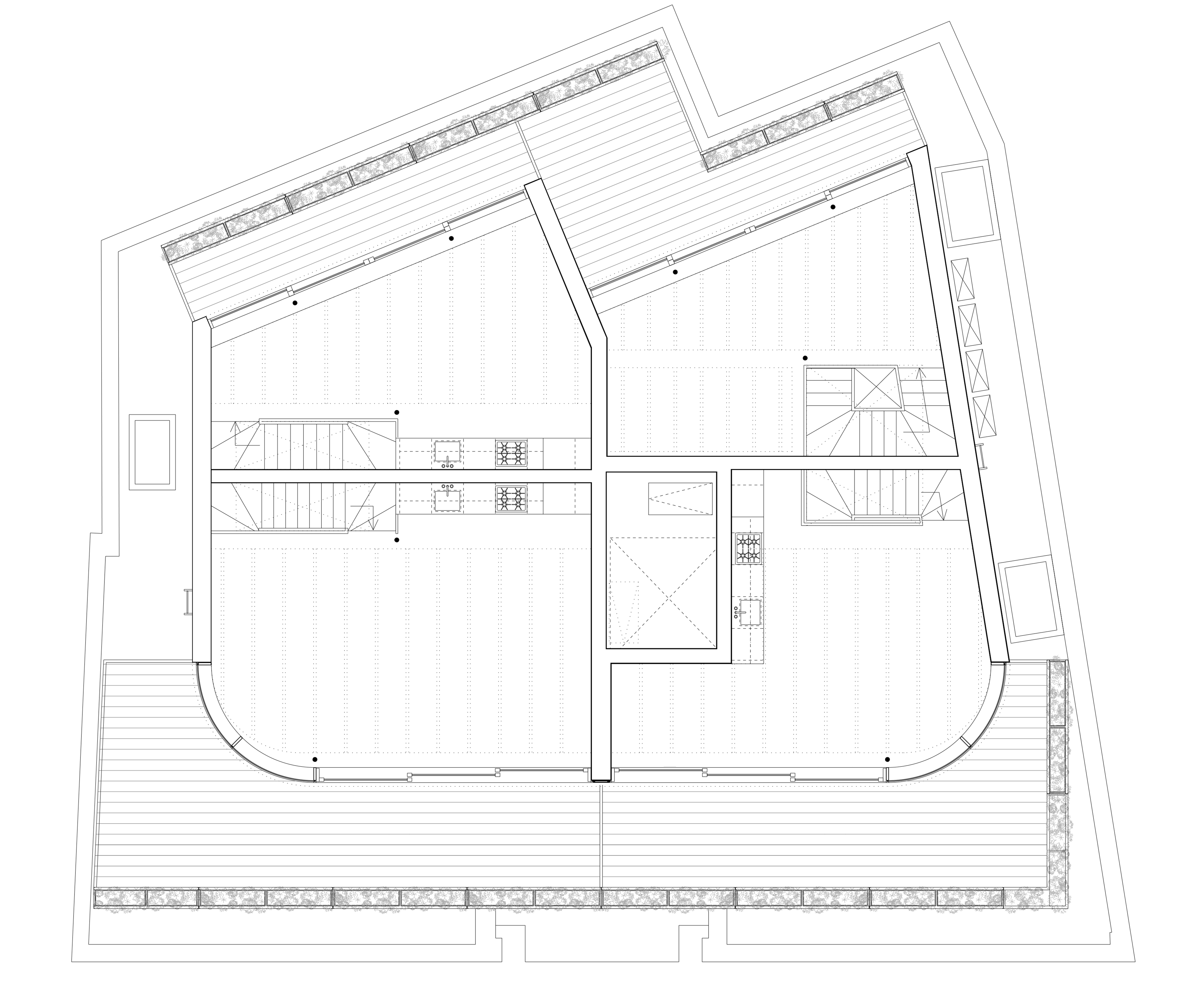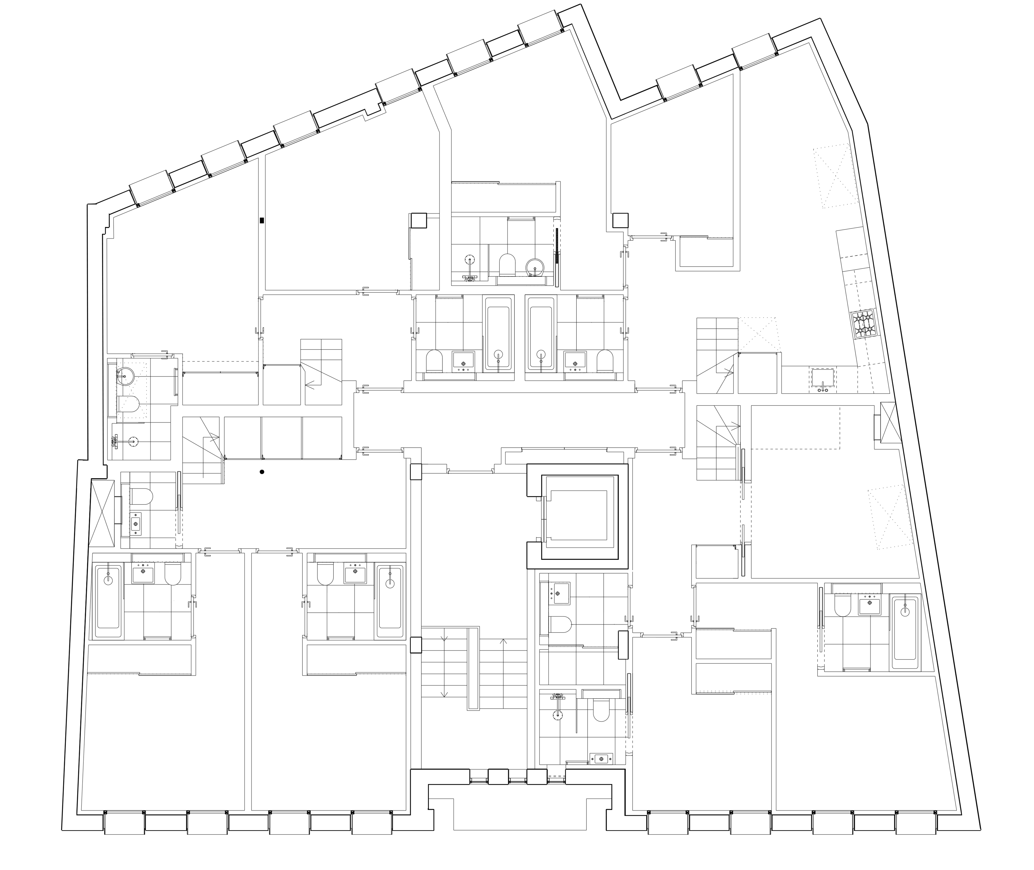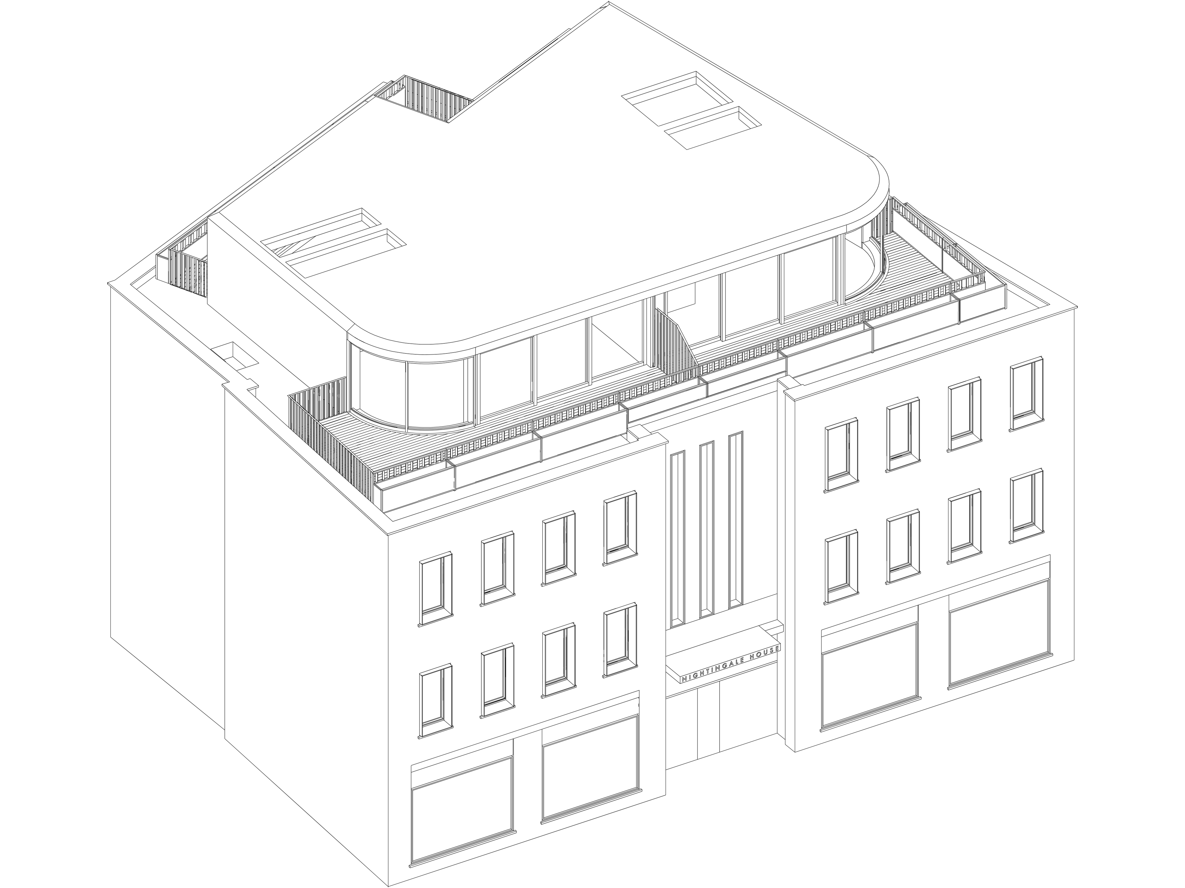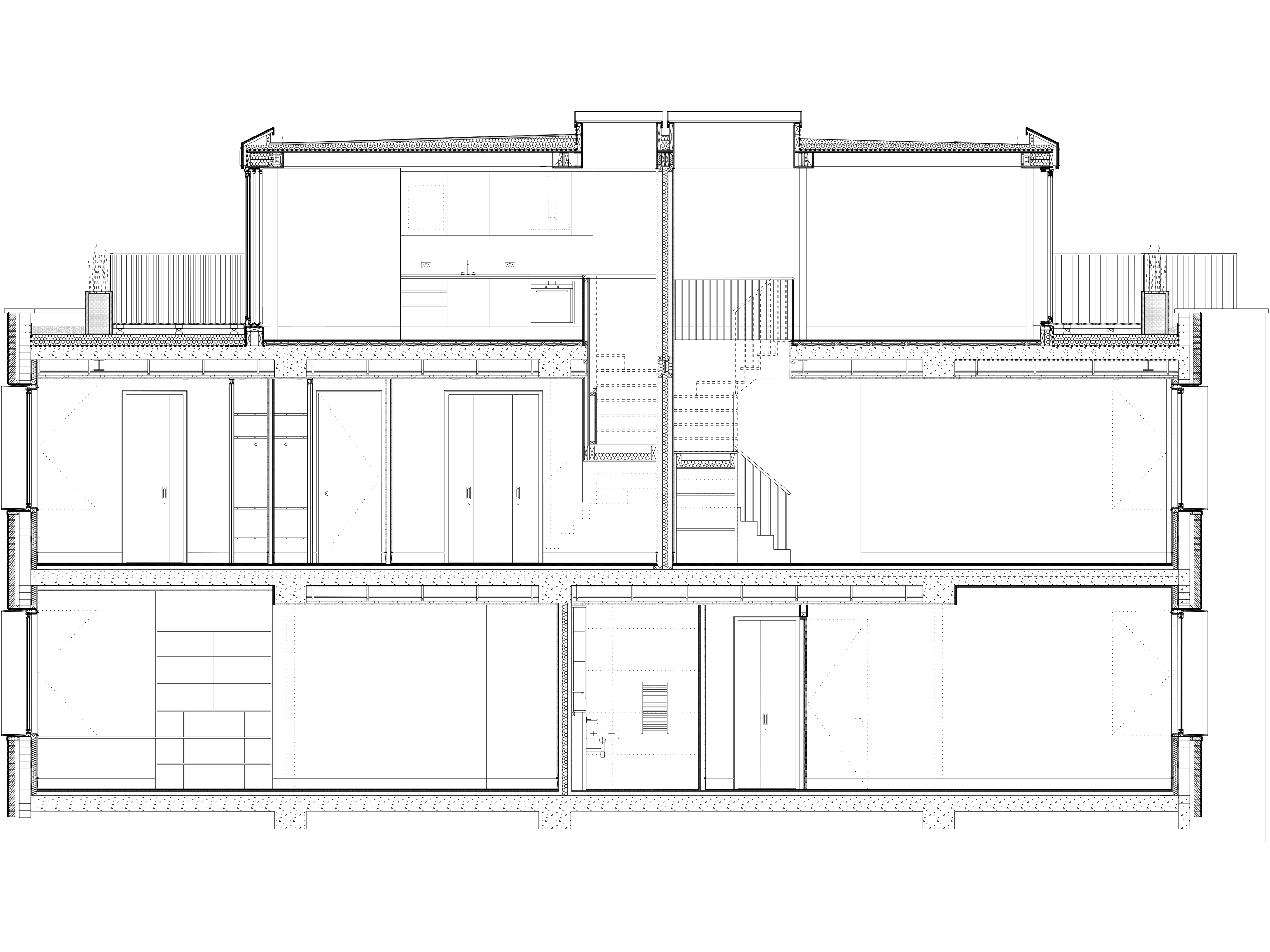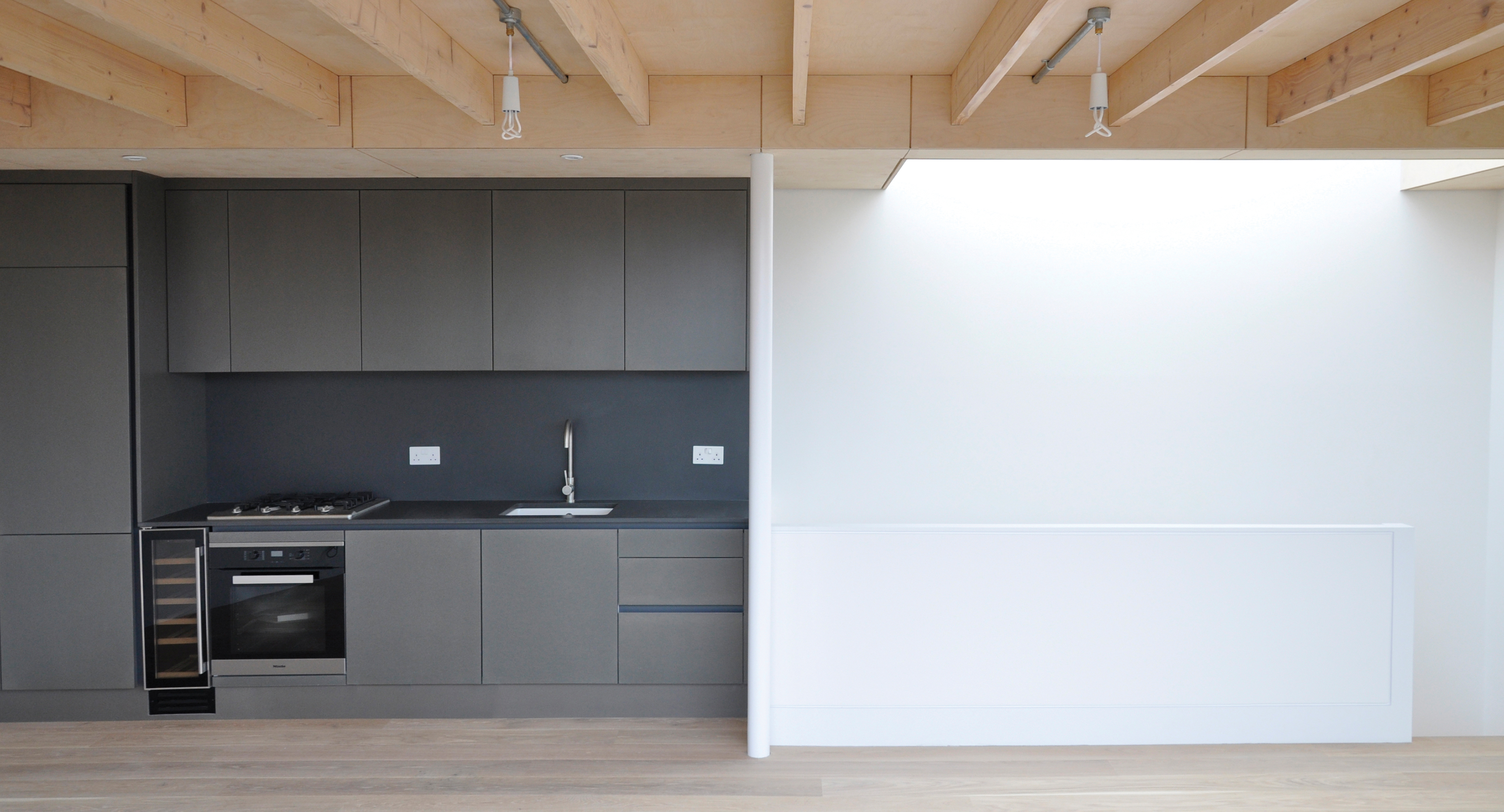 Following robust structural strengthening works, a rooftop extension was built in order to create four duplex flats on the upper floors. Conceived as the open and airy counterpart to the living space on the floors below, each flat has large roof lights, as well as generous and expansive sliding doors that lead to a terrace. The underside of the roof structure has been formed of birch ply and left exposed.