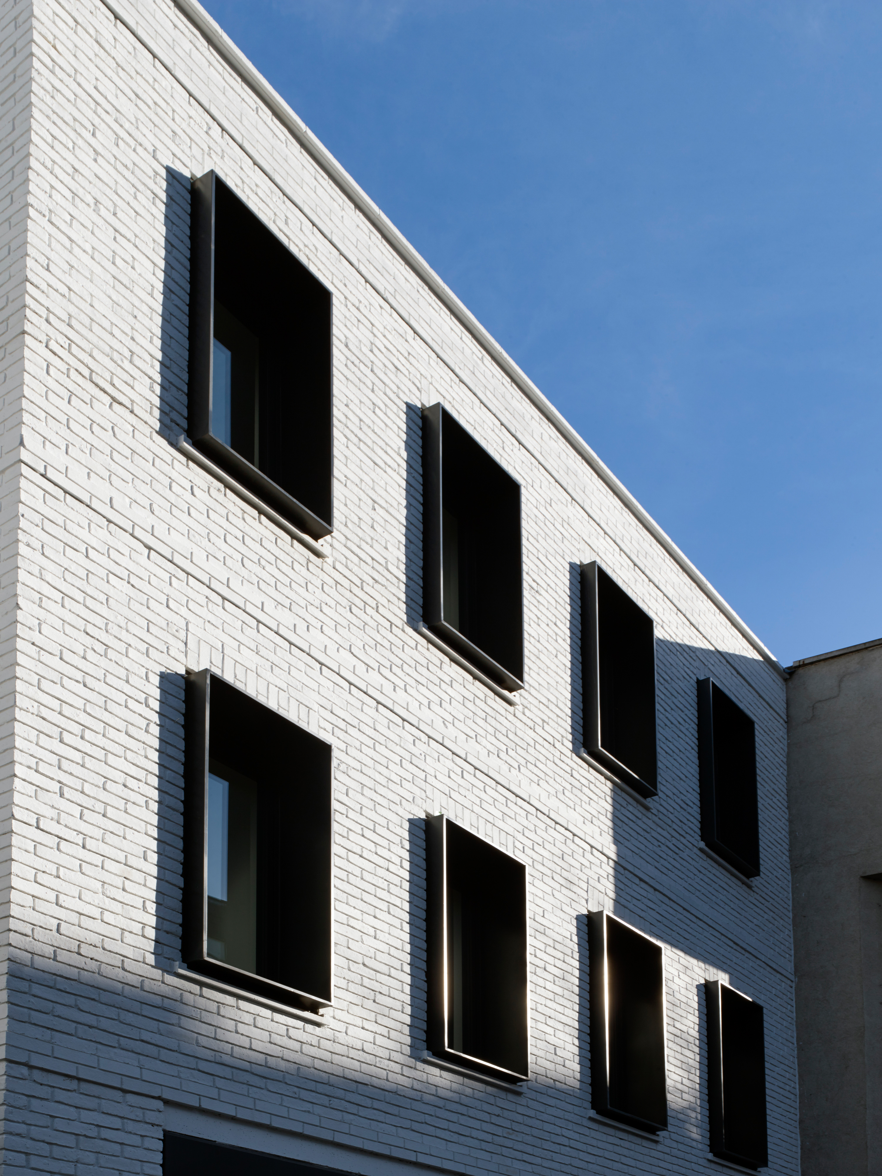 A simple contrast between dark and light runs as a theme throughout the project. The external brickwork has been treated with a white mineral wash, while deep and dark pressed aluminium window reveals protrude from the front and rear facades. By virtue of their depth, the reveals both enhance the rhythm of the windows, while also casting dramatic shadow on an otherwise bland facade.