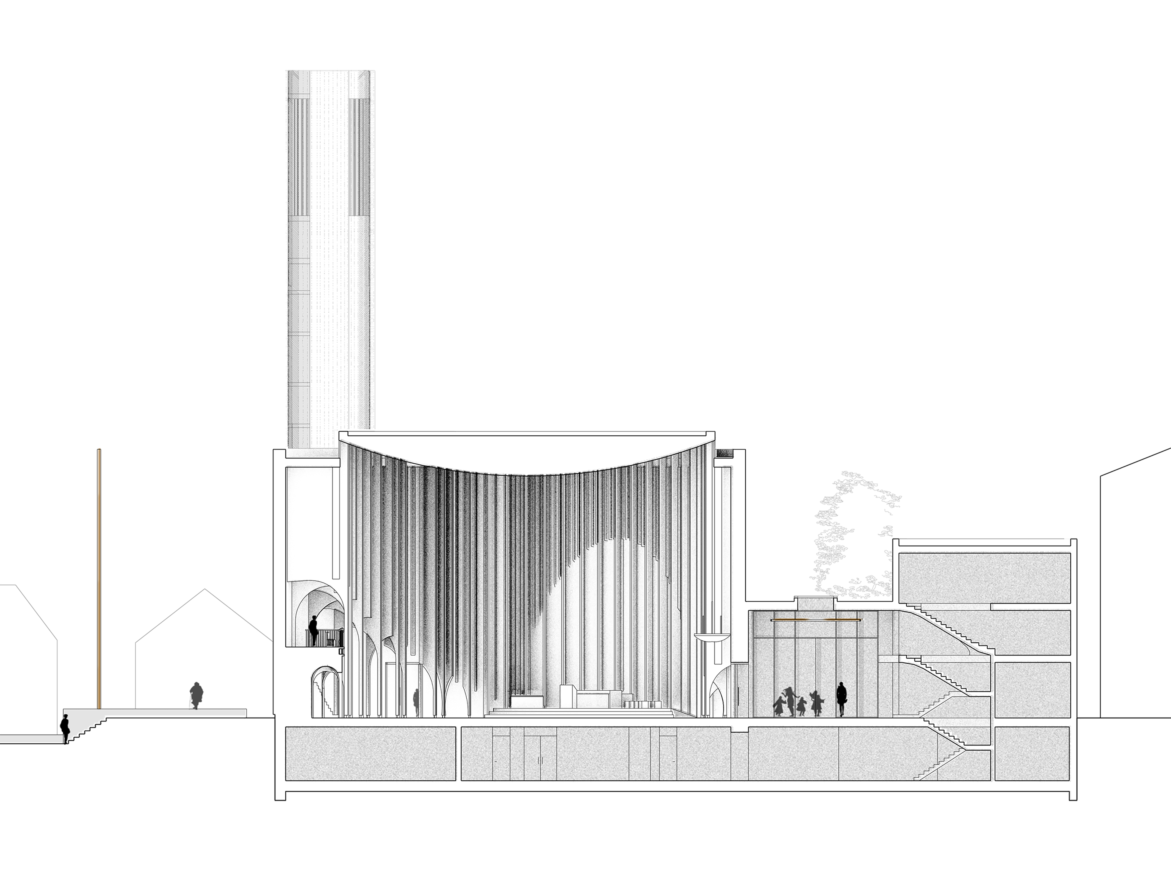 Our proposal is to give Porsgrunn a new beautifully crafted circular church that will unite the community and offer a symbol of solidity and unity on Church Hill. The concept is a campus on the existing site that creates a central courtyard around the new church that connects to the existing church hall with the new church square which mediates between these two main buildings. To achieve the requirements of the brief and the constraints of the site it seems to make better sense to connect the existing church. We have combined the programmes of both the existing church hall with the new functionality and programme of the new church.