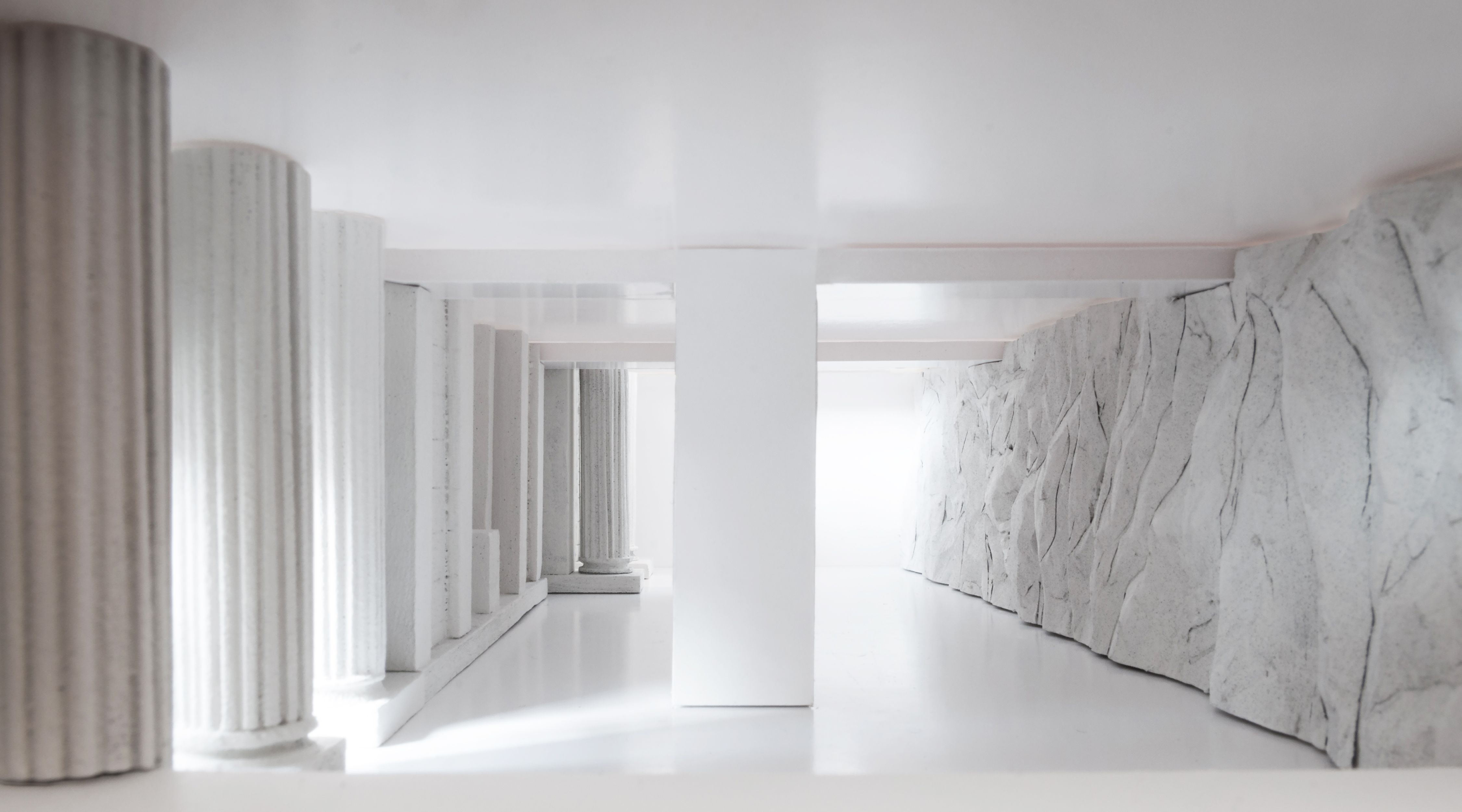Two opposing floor to ceiling facades line the gallery space. On one side a façade of Portland Stone is abstracted into white chalk, acting as a signifier of the edge of a building. This façade, designed by Roz Barr Architects, will relate to three buildings that relate closely to the RIBA archive. Facing this is a rougher hewn surface of chalk, acting as a symbol of the edge of a country drawing to mind the white cliffs of the South Coast of England. The structure and detailing of the built forms are central to this proposal, that sets out to explore the physical and material boundaries of our interpretation of an edge. We propose the carving of the chalk wall and façade would be made by craftsman Philip Surey, who collaborated with Roz Barr on the gold gilding of the interior at St Augustines.