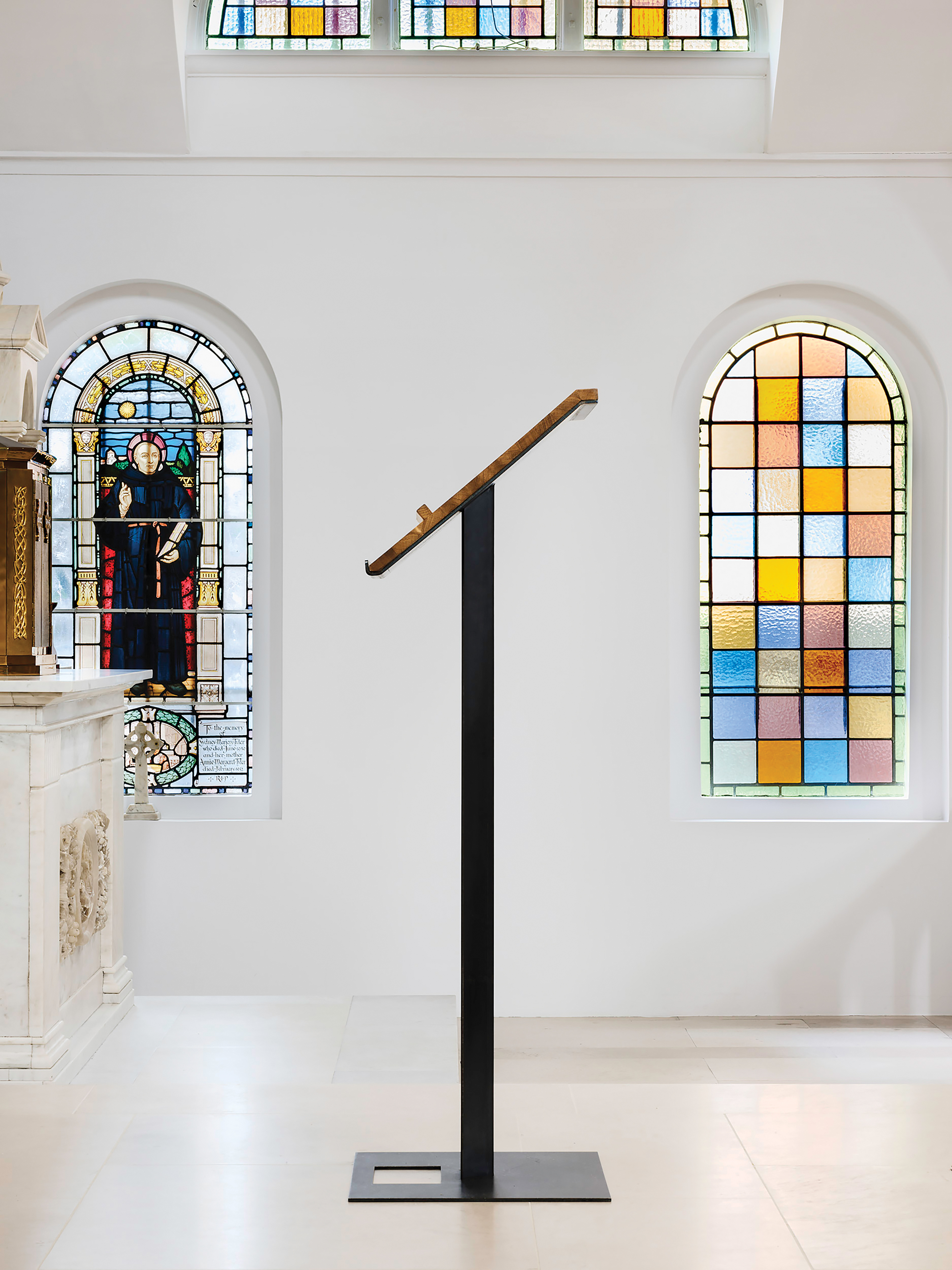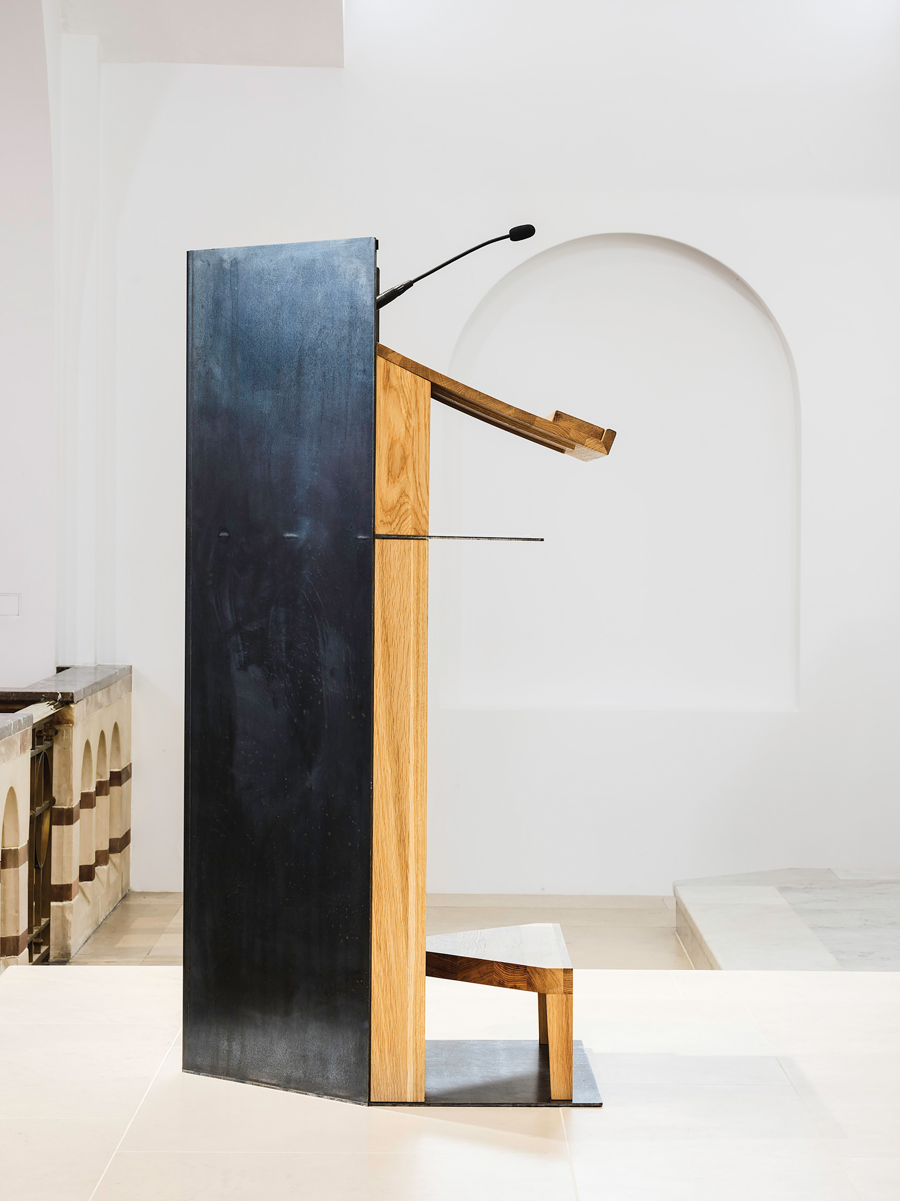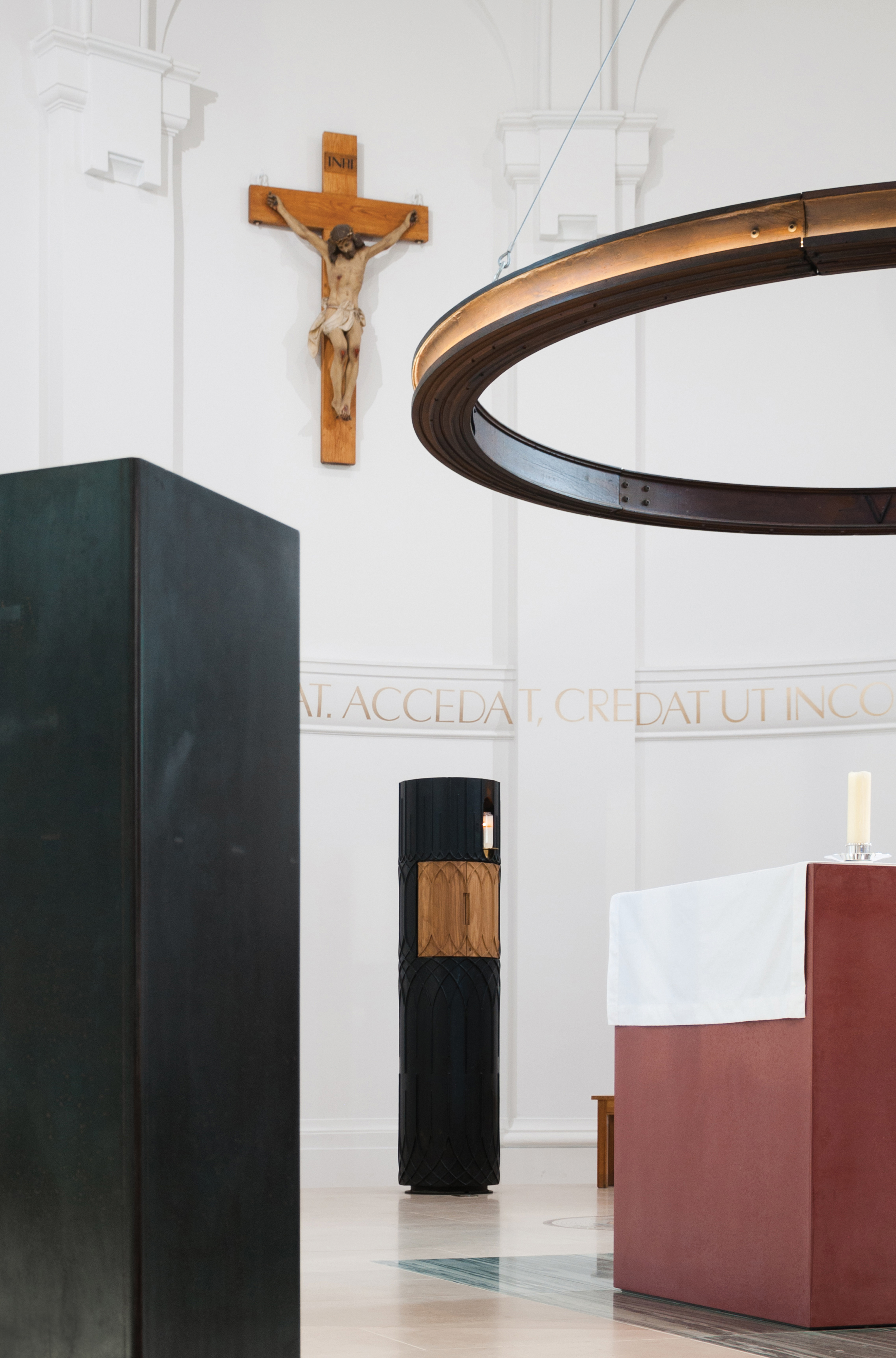 New confession booths were formed, delicately detailed to echo the form of the internal vaulted ceilings. The floor level of the altar was raised and reconfigured, with a large slab of green marble, which must have sat rather heavily as a backdrop to one of the side altar, transformed by being carefully integrated into the high altar floor. Combined with a large, beautifully formed cast iron circular light fitting, this subtly defines the aura of the high altar, reinforced by a very delicate fresco, hand-painted and depicted in gold leaf on the rear wall of the altar. The architect’s fruitful collaboration with artisans and makers permeates this project, with the focus being the high altar itself, a strong simple form in blood red Venetian plaster, by the ceramicist Julian Stair.