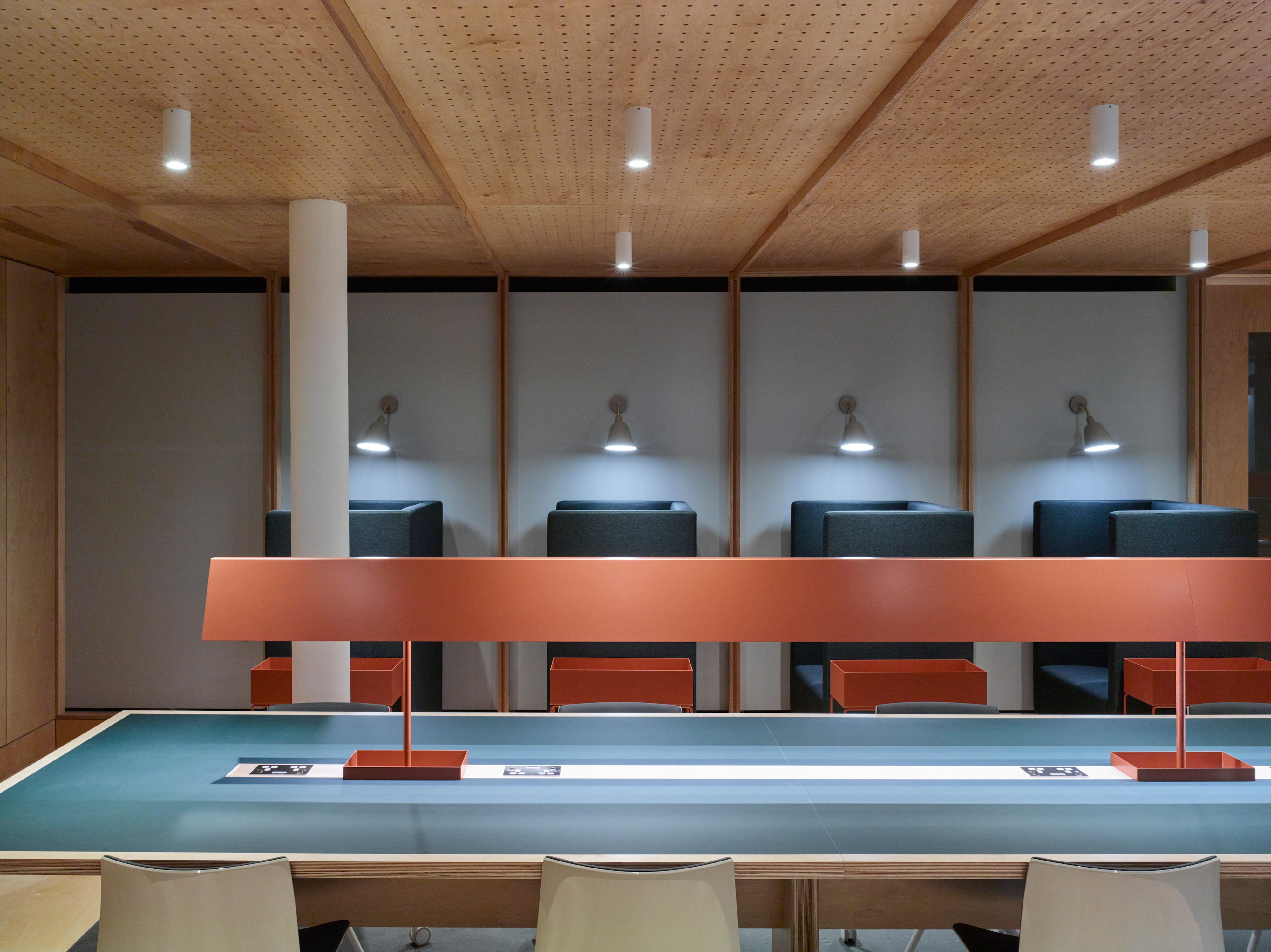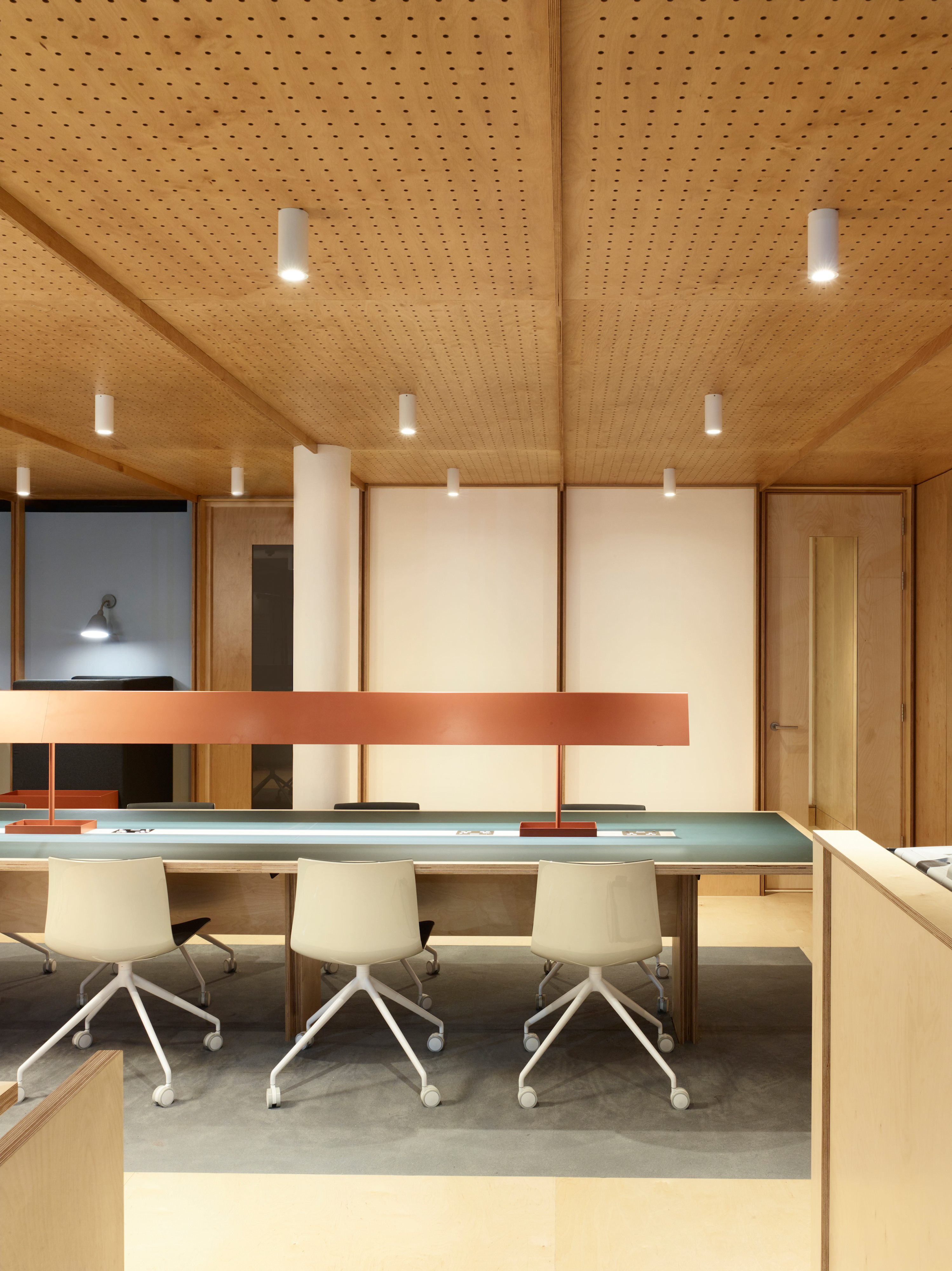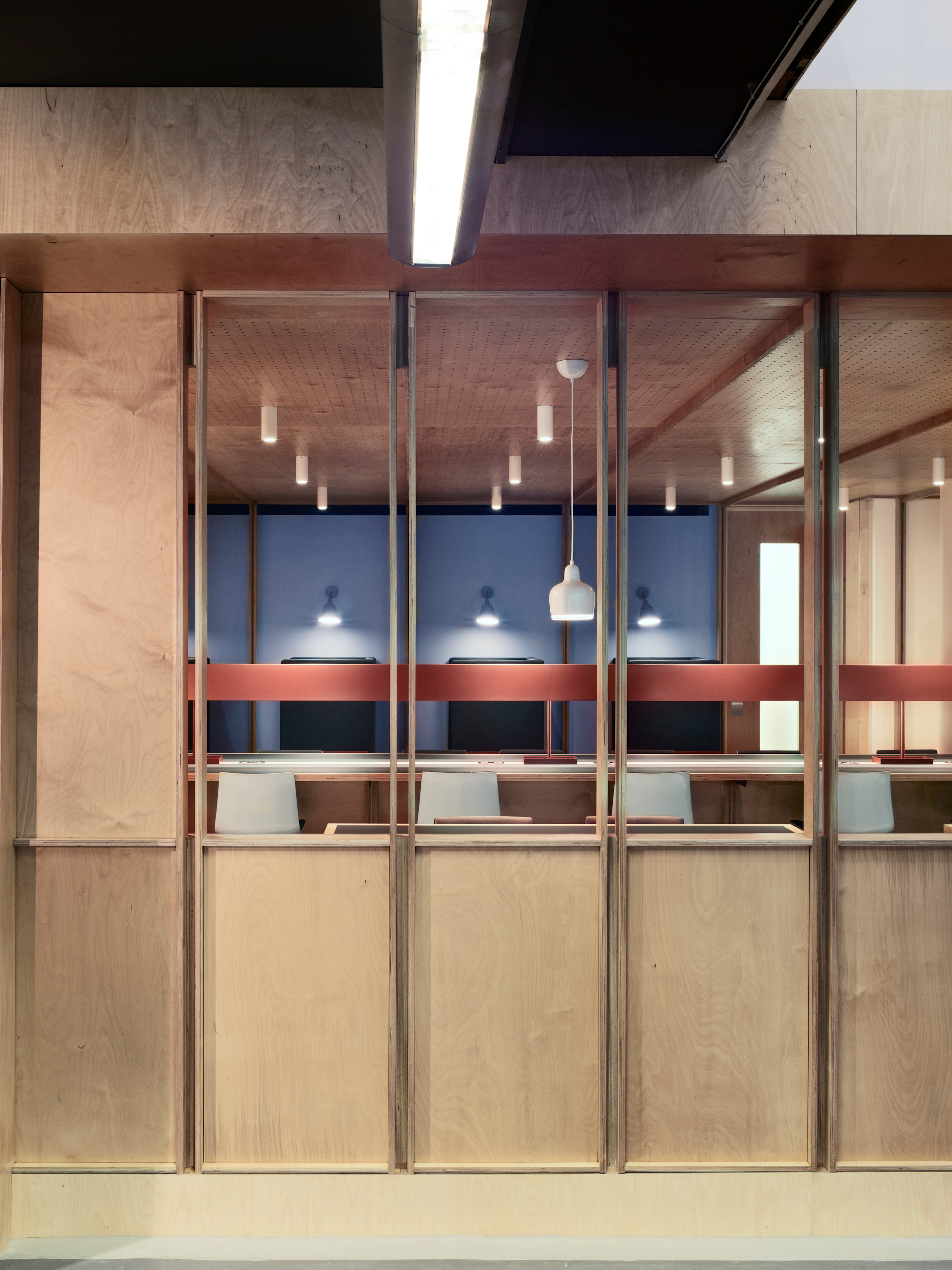 The flexible co-working space was formed within the existing gallery of building products on the lower ground floor, and is intended for use by both internal staff and external companies. Evoking a traditional library, the plywood enclosure is seperated from the gallery space by a timber screen. The grid is configured to work with standard-sized plywood sheets; those on the ceiling are perforated and backed with felt to deaden the acoutistic. Framed areas of plasterboard, set within the panels, allow for presentations or display.