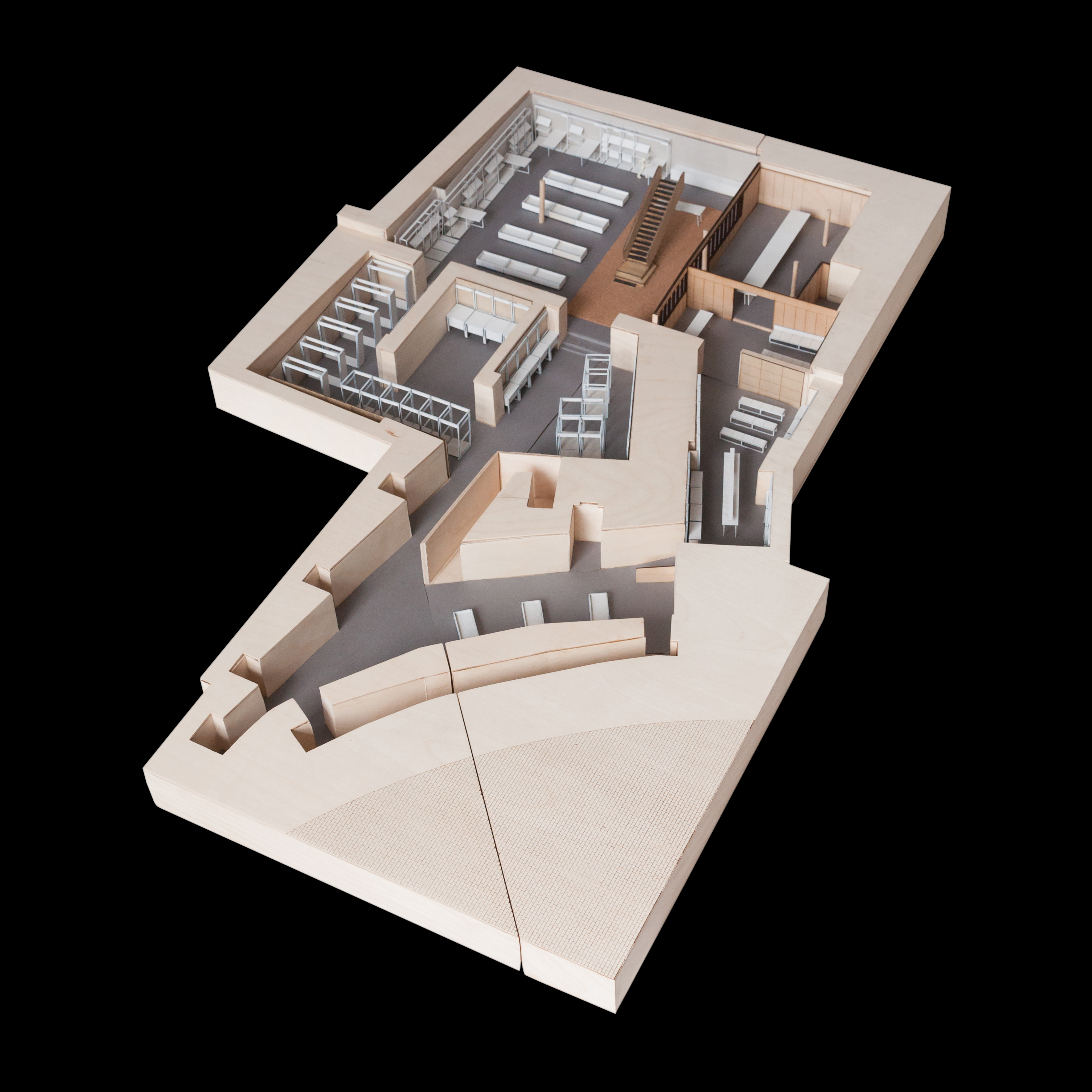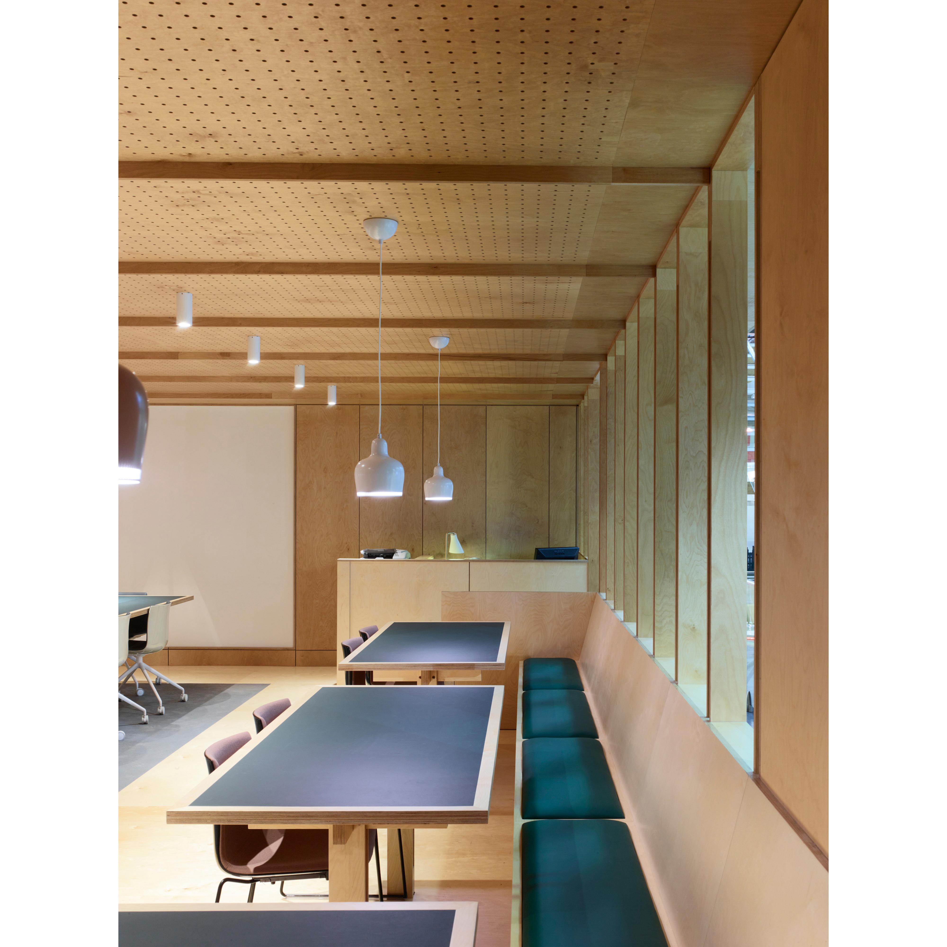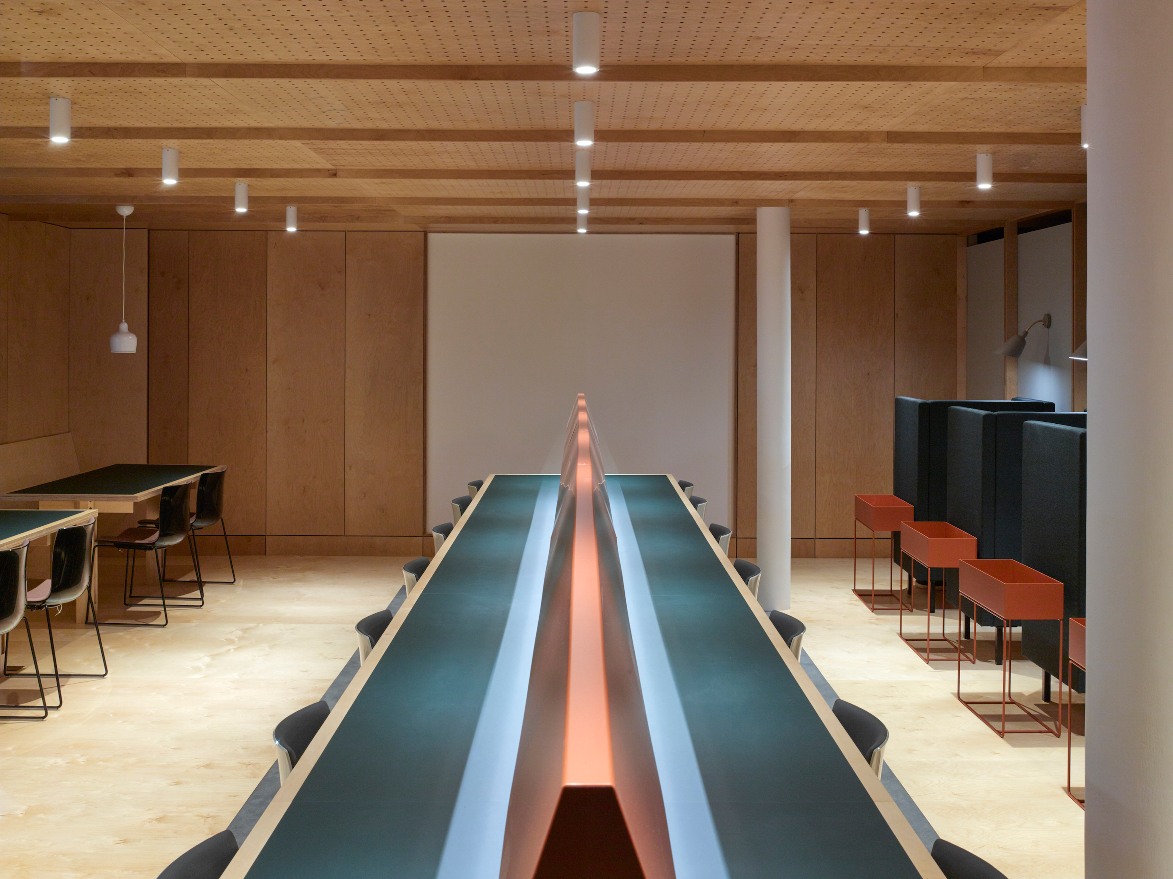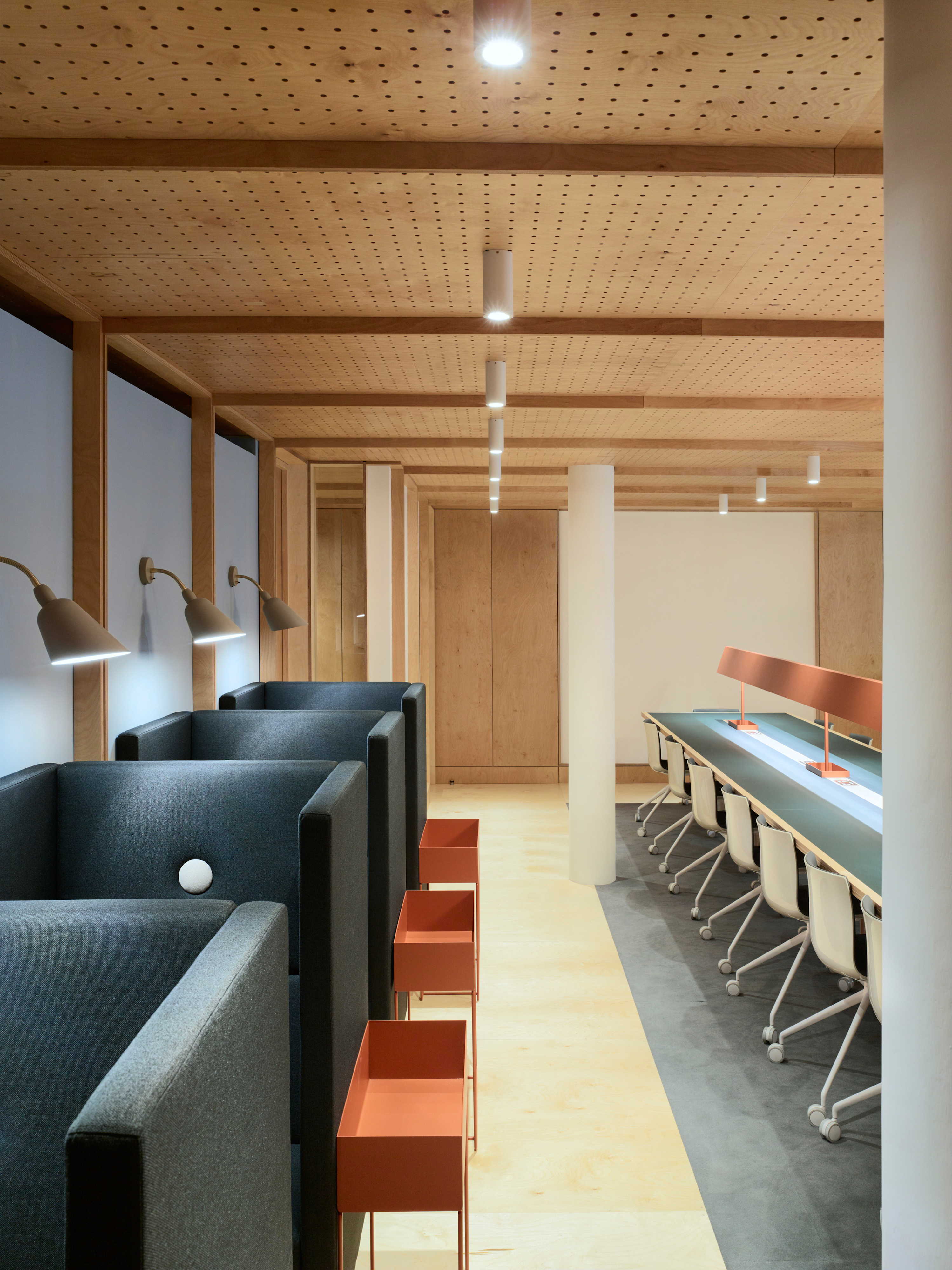 The flexible co-working space was formed within the existing gallery of building products on the lower ground floor, and is intended for use by both internal staff and external companies. Evoking a traditional library, the plywood enclosure is seperated from the gallery space by a timber screen. The grid is configured to work with standard-sized plywood sheets; those on the ceiling are perforated and backed with felt to deaden the acoutistic. Framed areas of plasterboard, set within the panels, allow for presentations or display.