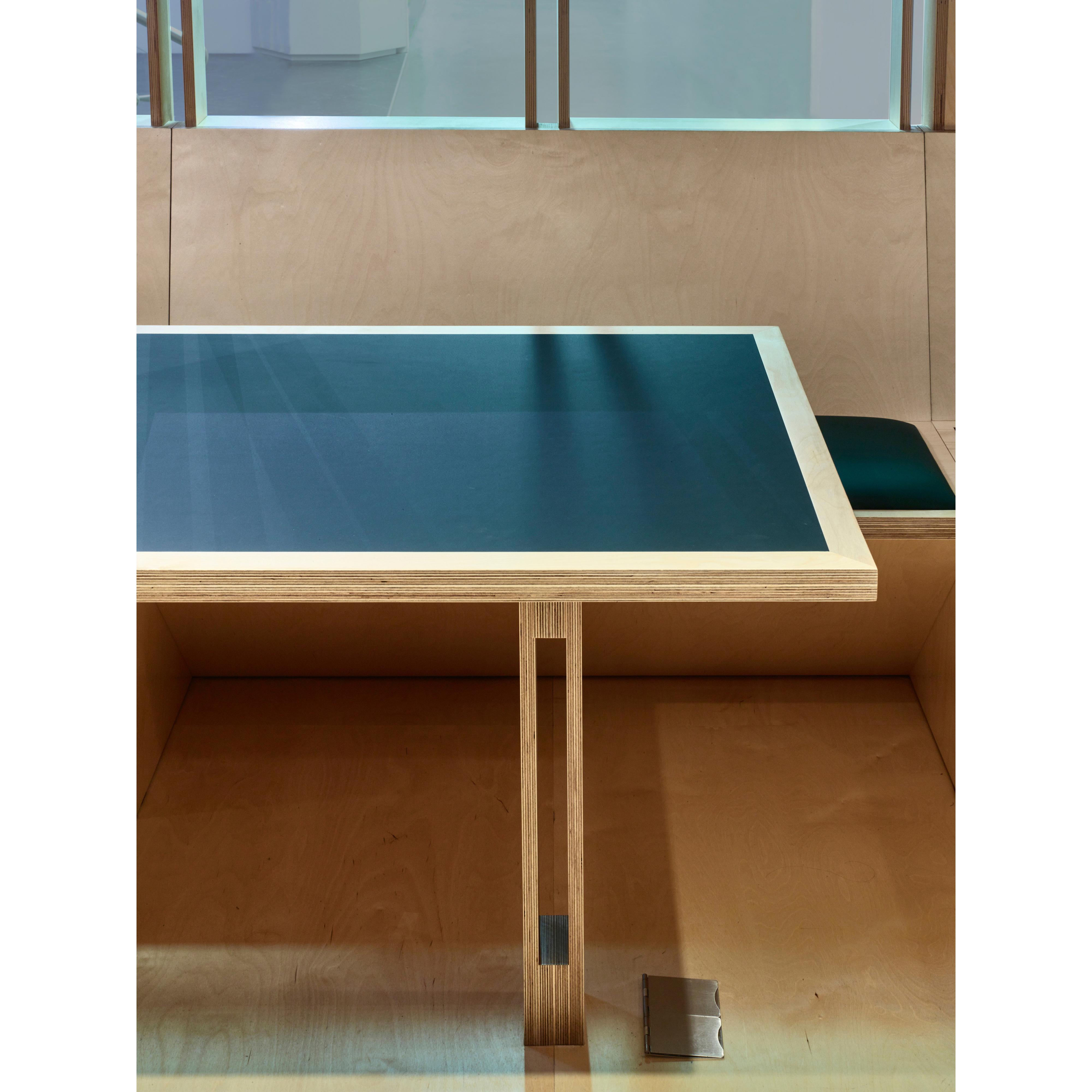 An inlay of carpet in the plywood floor defines a central space, suggesting a variety of work areas within the open space. To comply with regulations without compromise, the plywood panels were impregnated with fire retardant rather than surface finished. This allowed flexibility to moditfy items on site without compromising the fire rating. Specialised Panel Products, a company well-known for its use of non-toxic finishes, invested significant resources in developing this product and are unique in using non-toxic finishes.