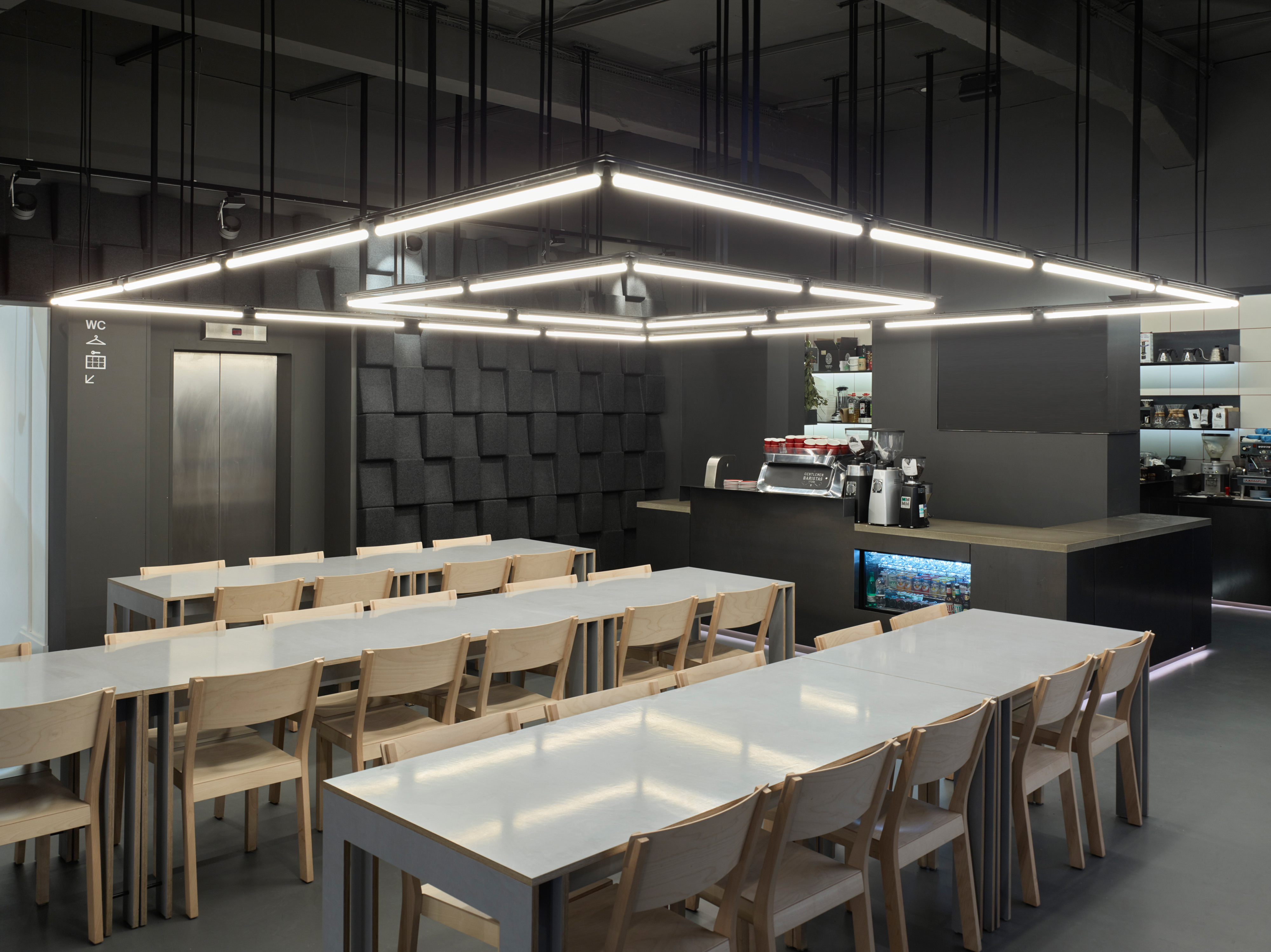 We also designed the tables. Each is made from a singel sheet of laminated birch ply. The chairs were supplied by Fuse and Co and have a clever acoustic baffle on the underside of the seat. We worked with metal fabricators CDS on our design for the new cafe lighting and a separate fitting used throughout the ground floor.