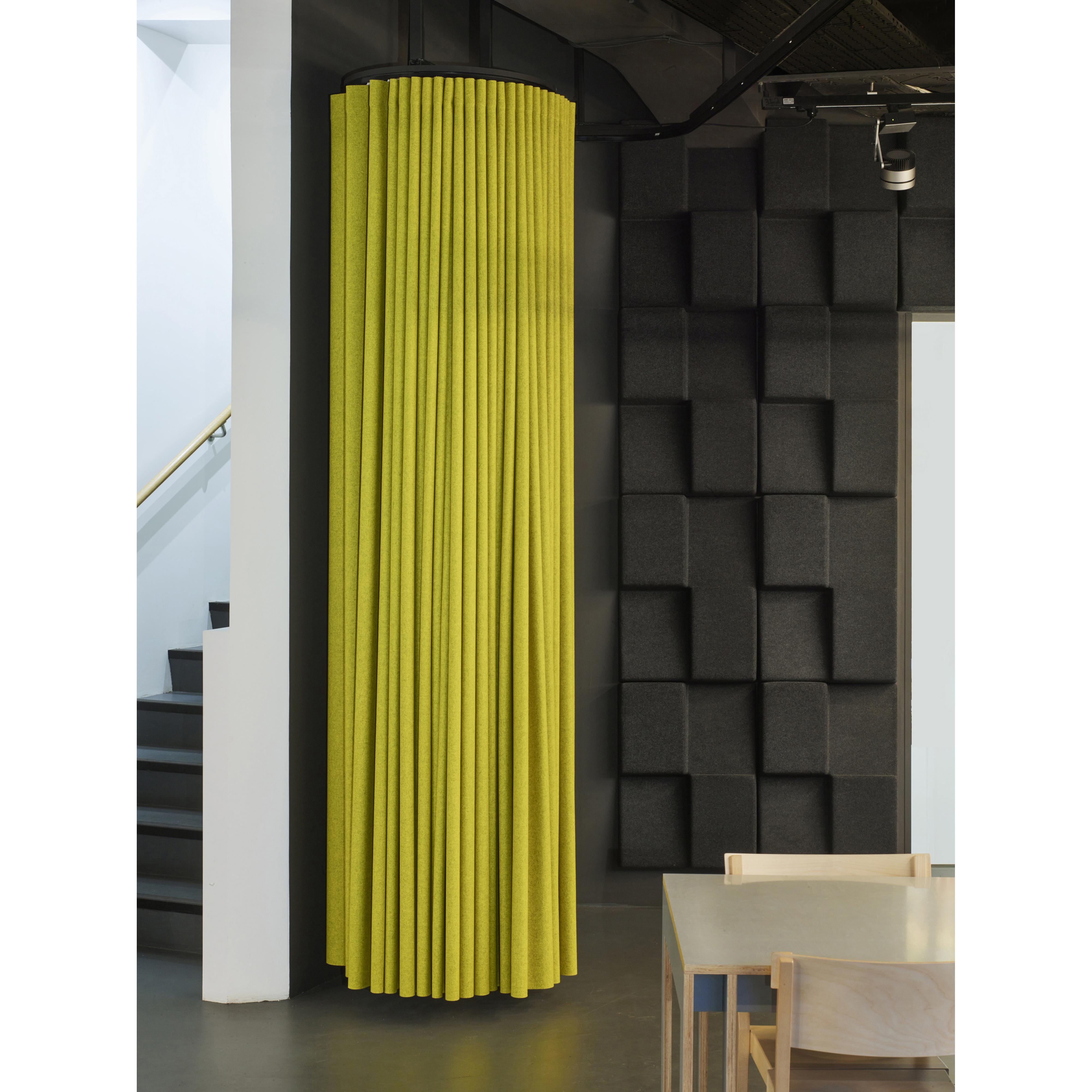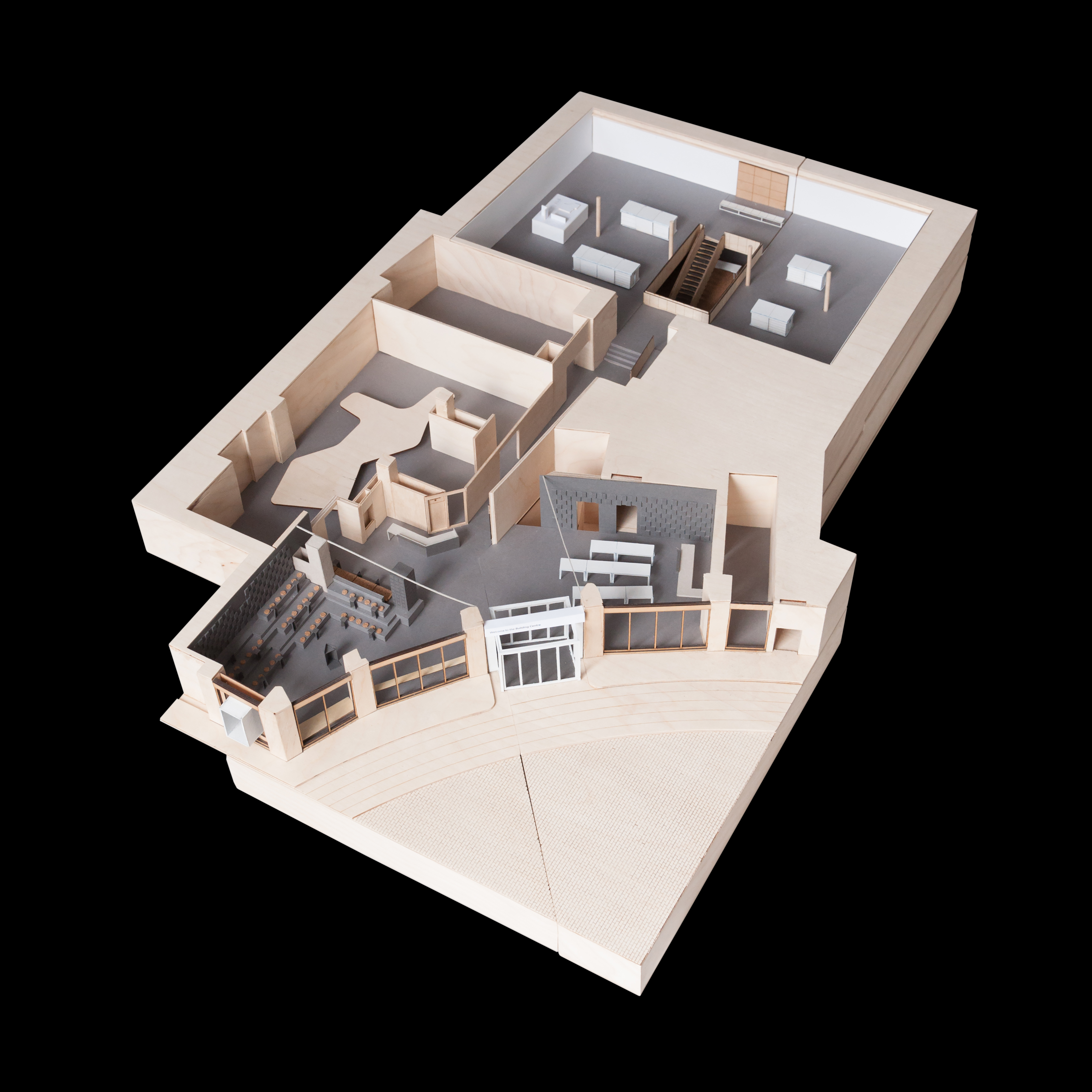 Given its location within the main entrance foyer, we wanted to explore ways to deal with the acoustical problems. A new felt wall was created, which can be used for displaying books and journals. A new yellow felt curtain sits like a column at the foot of the stairs and can close off the cafe during an event.