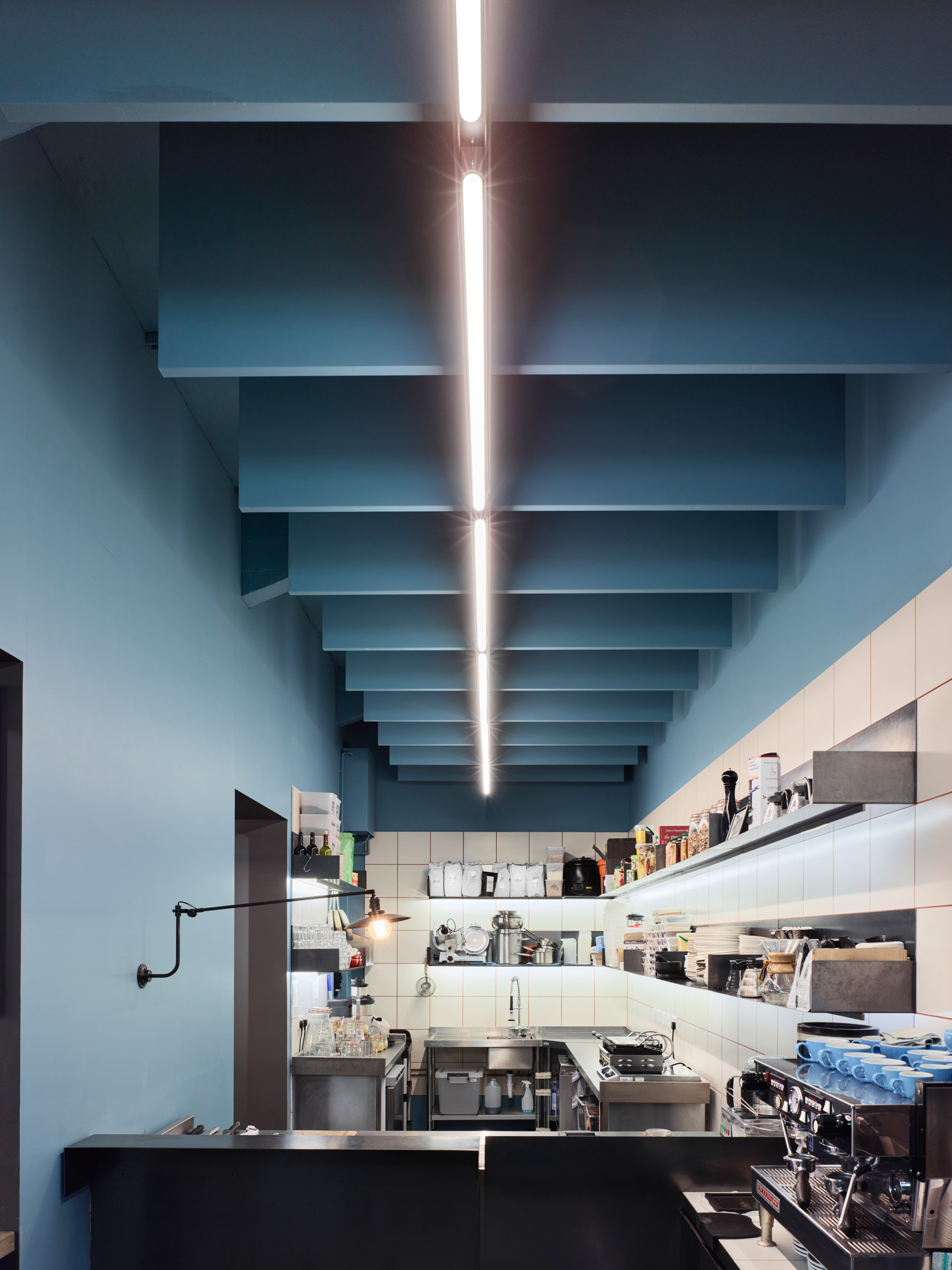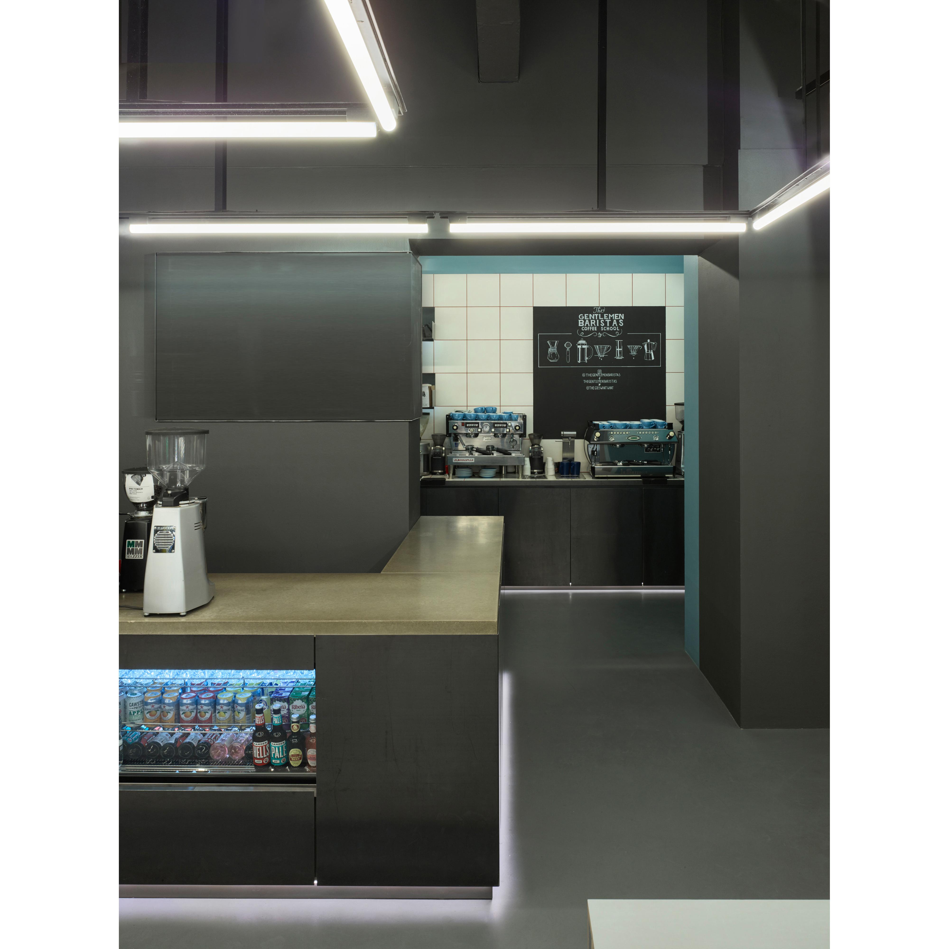 A new servery was designed for the new operator - The Gentleman Bariastas - featuring a new concrete and waxed steel counter and a kitchen for preparation. The space is outlined in a white porcelain tile, whichwe edged with red grout.