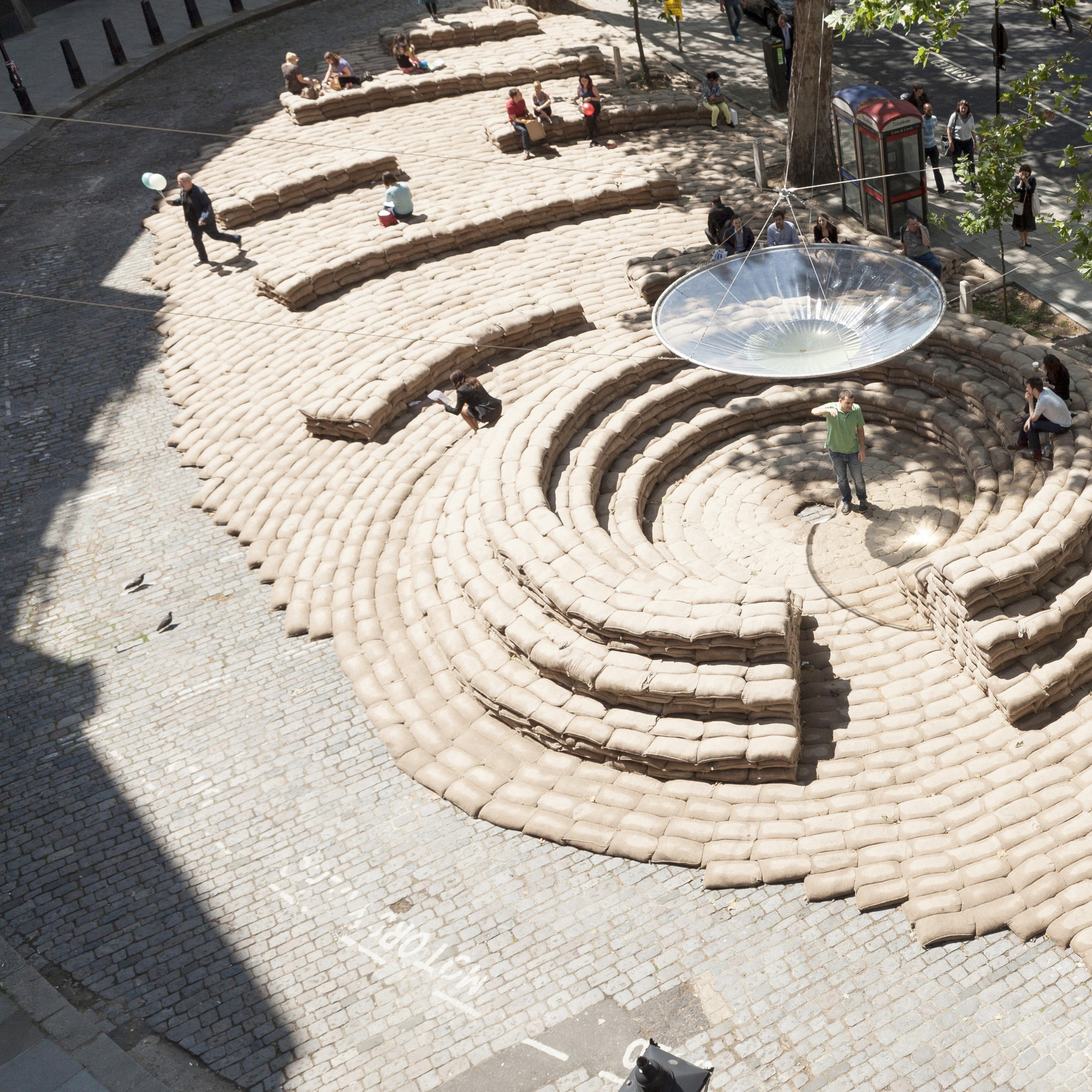The crescent outside The Building Centre was transformed into a temporary urban park using 7,000 sandbags for 10 days as part of the London Festival of Architecture. Oculus, as it was named, was the latest in a series of temporary interventions in Store Street’s South Crescent to test ideas for the future use of this small but significant piece of public realm.