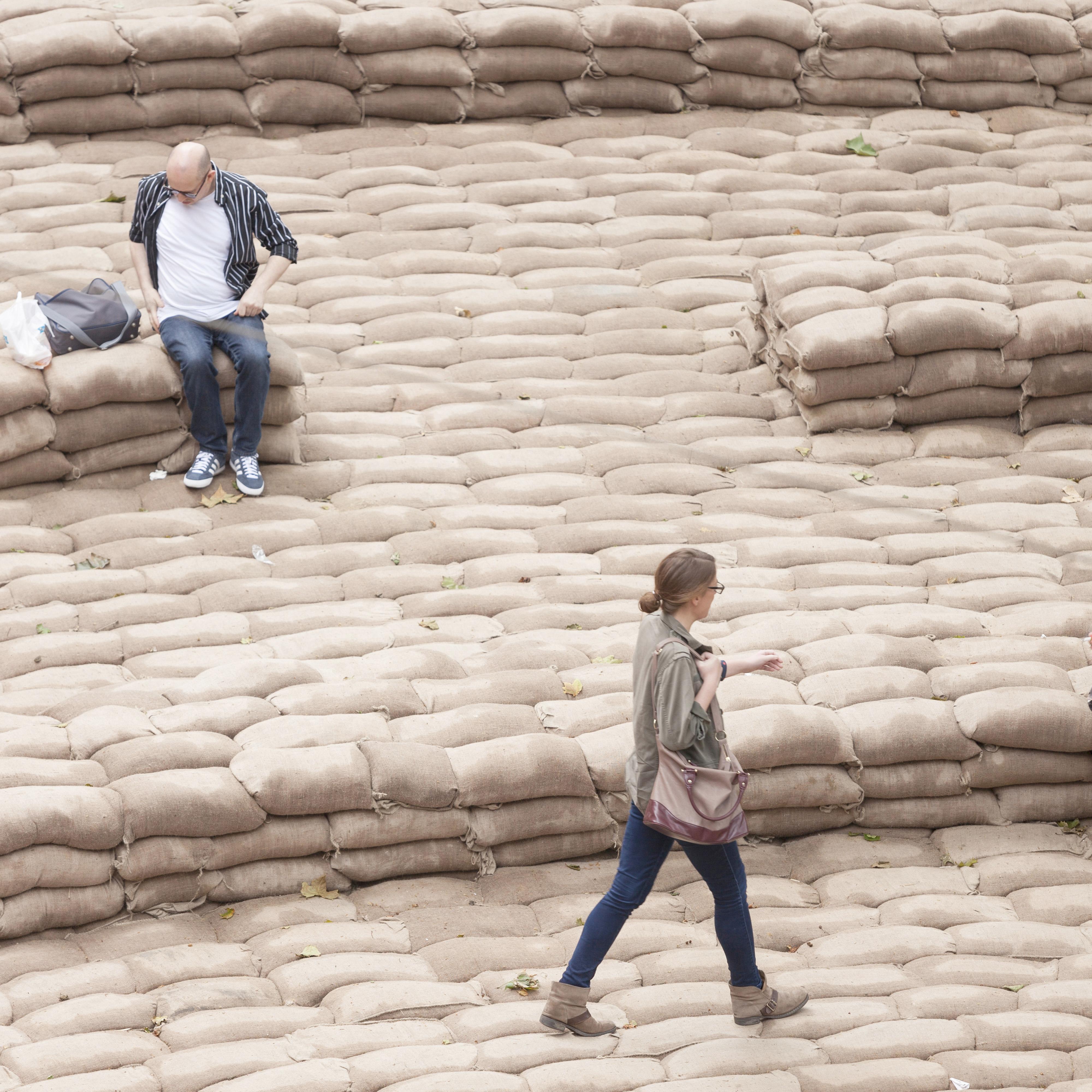 The notion of using hessian sandbags - an object usually associated with either war, disaster or flooding became appealing. The duality of how we perceive an object and its associated application transformed into something elegant through scale and ordering was of great interest. Sandbags are a ready made object and the laying of this has connotations of a community type project where we could transform this new public space in a short amount of time using a relatively low cost material. Traditionally public squares or spaces are paved or decked in stone, or timber and so we enjoyed the idea of using a material object that is associated with temporality and is assembled in a similar manner to create this new temporary space.